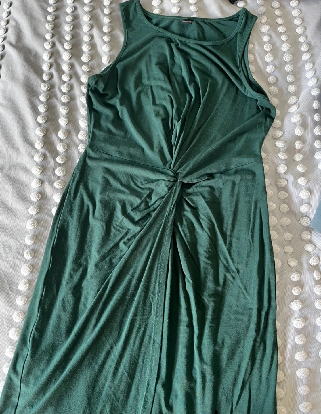 Selling a cute green dress with a twist front detail. It's in great condition and ready for a new home! The dress is a lovely shade of green and features a stylish knot at the front. Perfect for casual outings or dressing up for an event