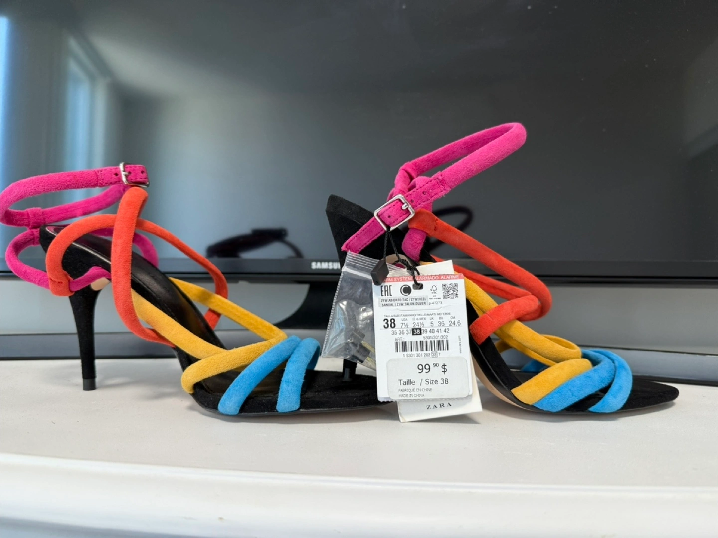 These Zara sandals are super fun with their bright colours! They feature a mix of pink, orange, yellow, and blue straps on a black heel. The size is 38 (EU), which is about a size 7.5 in Canada/US. The original price was $99.90
