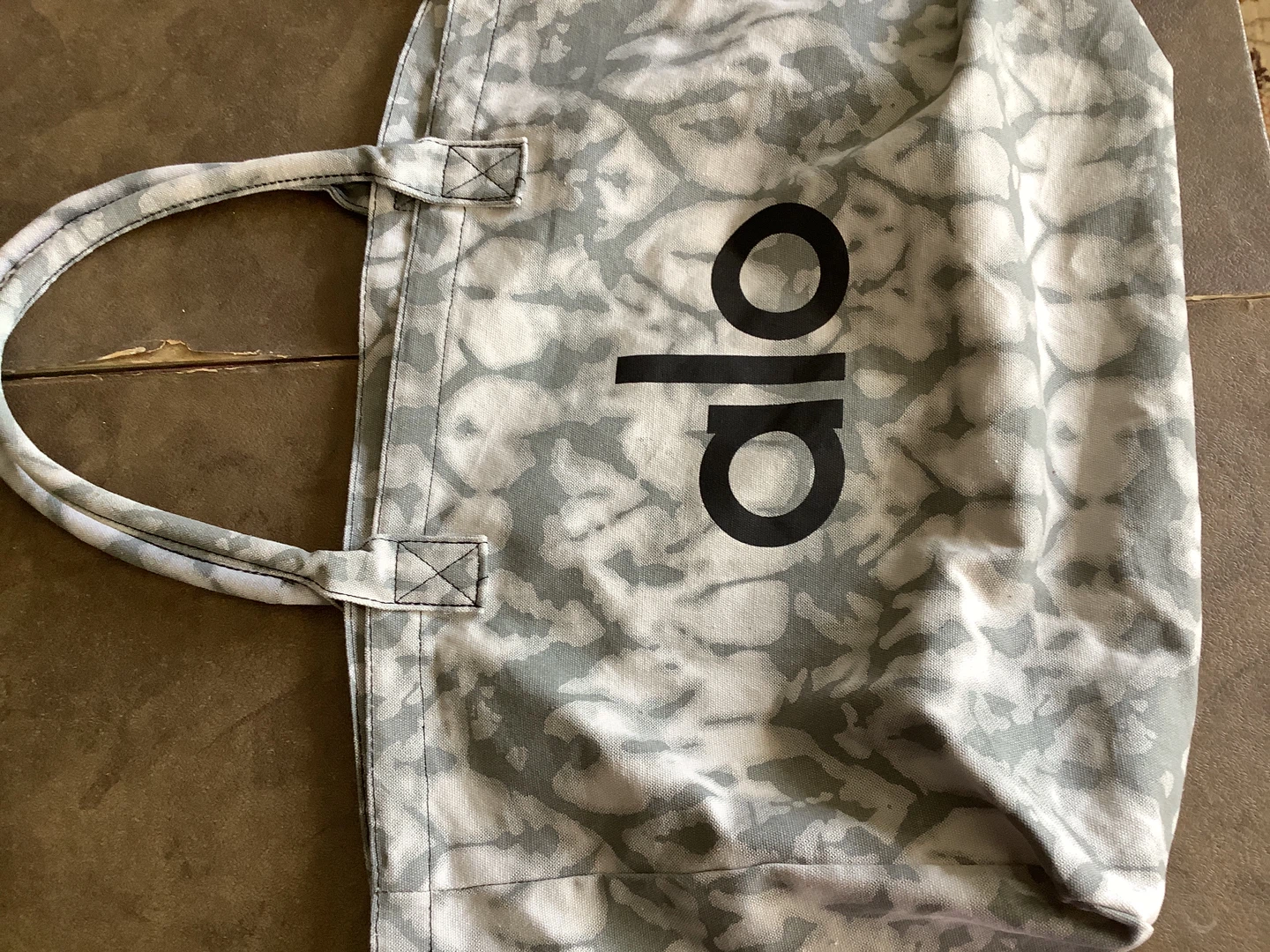 Selling an Alo Yoga tote bag in a grey and white pattern! It's in great condition and perfect for carrying your essentials to yoga class or just around town