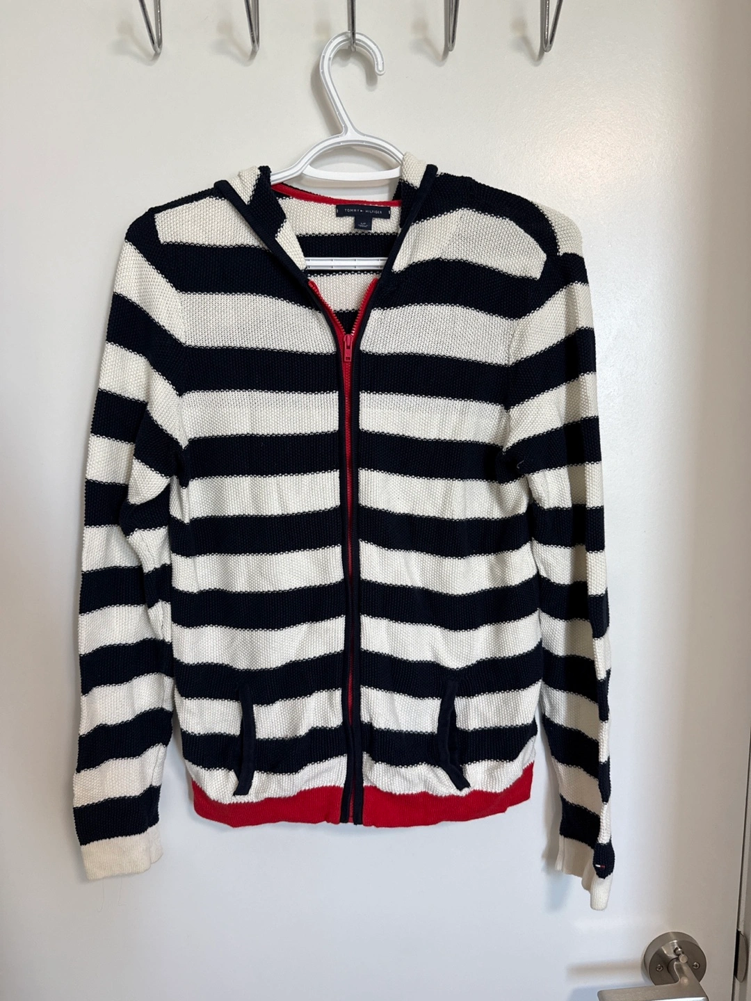Here's a Tommy Hilfiger knit zip-up hoodie! It features a classic striped design in navy and white with a red zipper and trim. Perfect for layering or wearing on its own