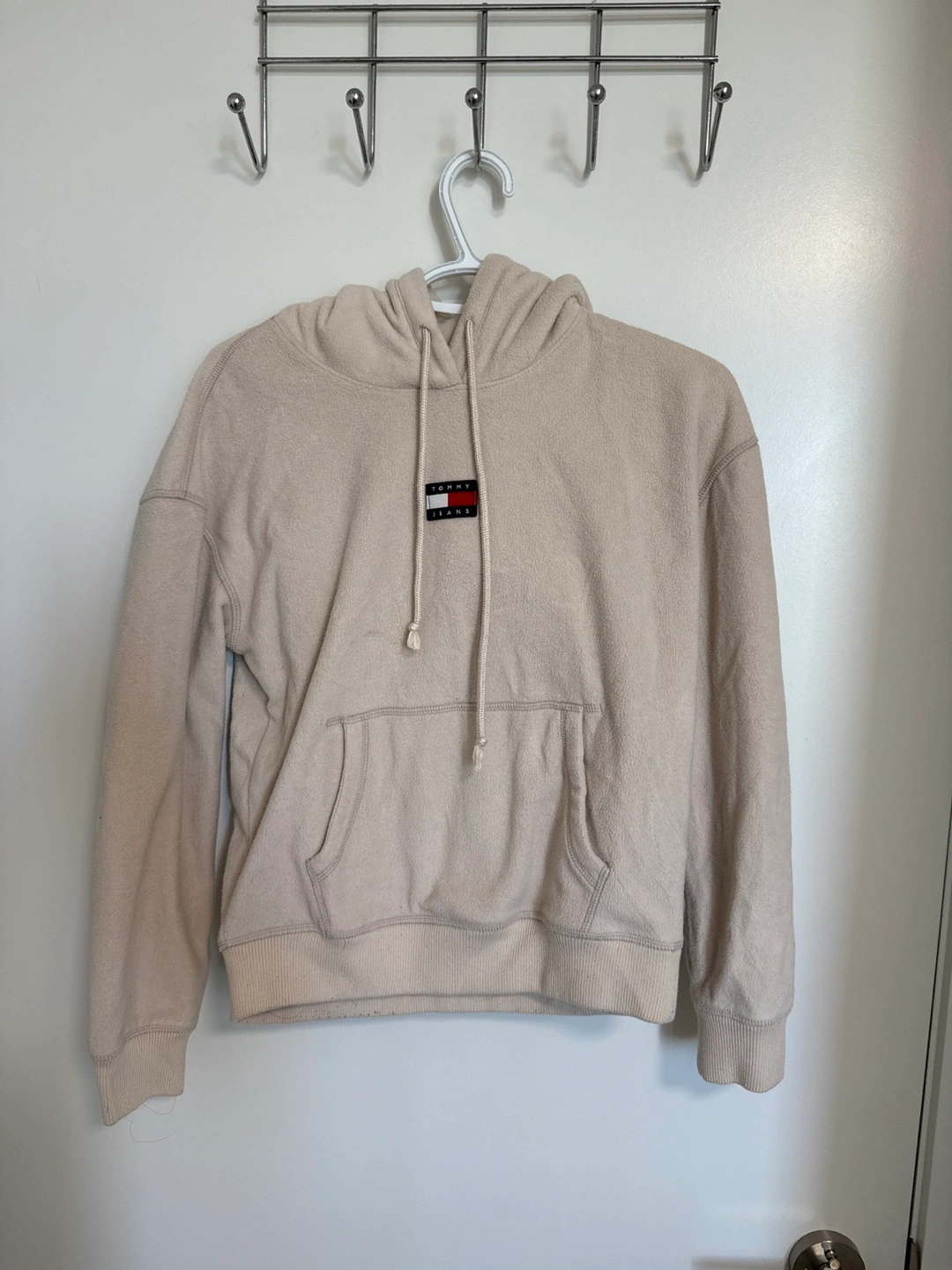 Cozy Tommy Jeans fleece hoodie in a neutral beige colour! It's a classic and comfy piece for layering or just lounging around. Perfect for those cooler Canadian evenings!
