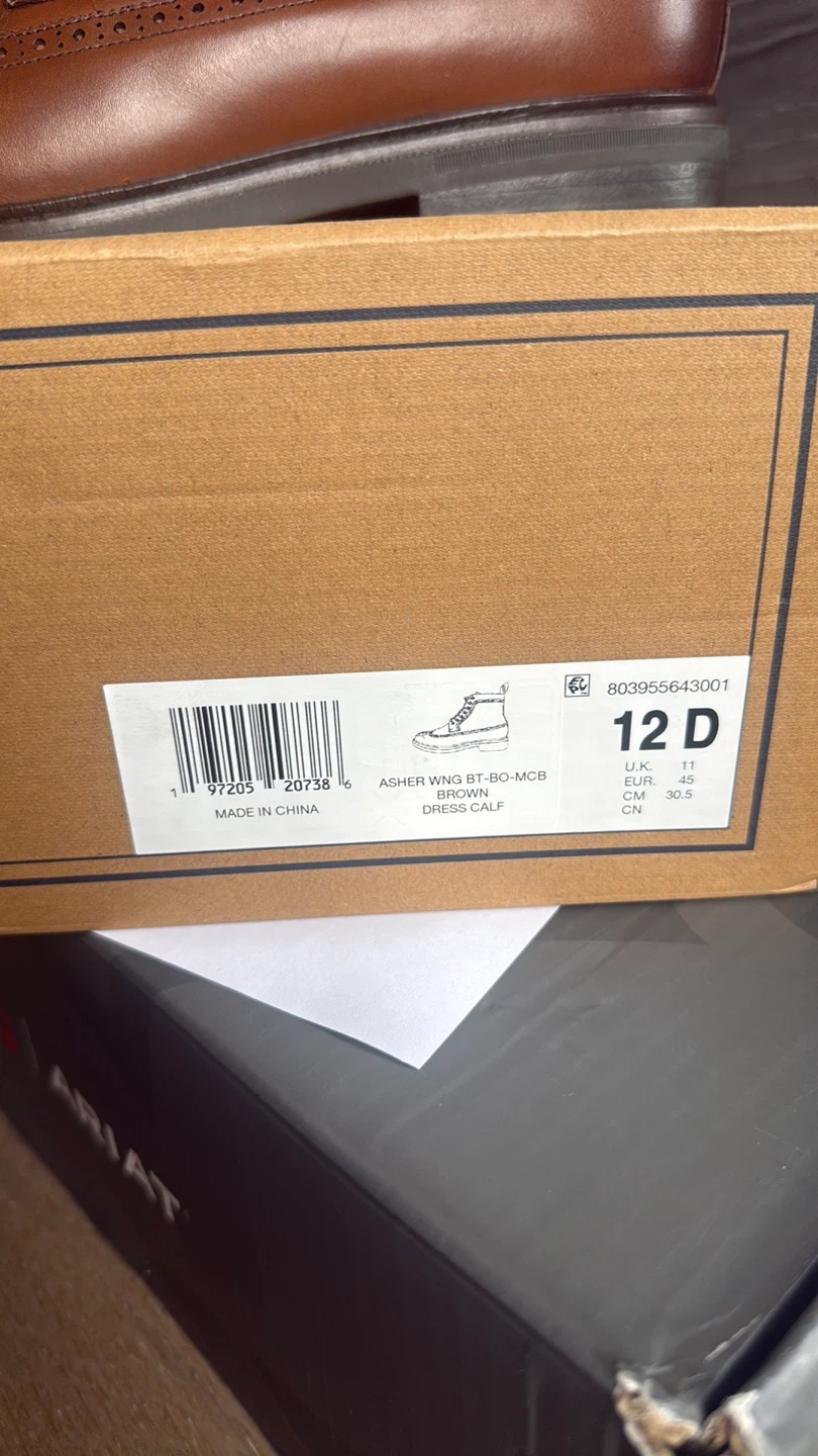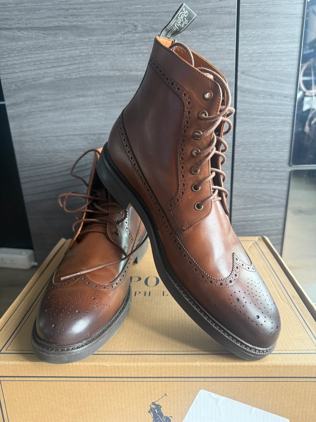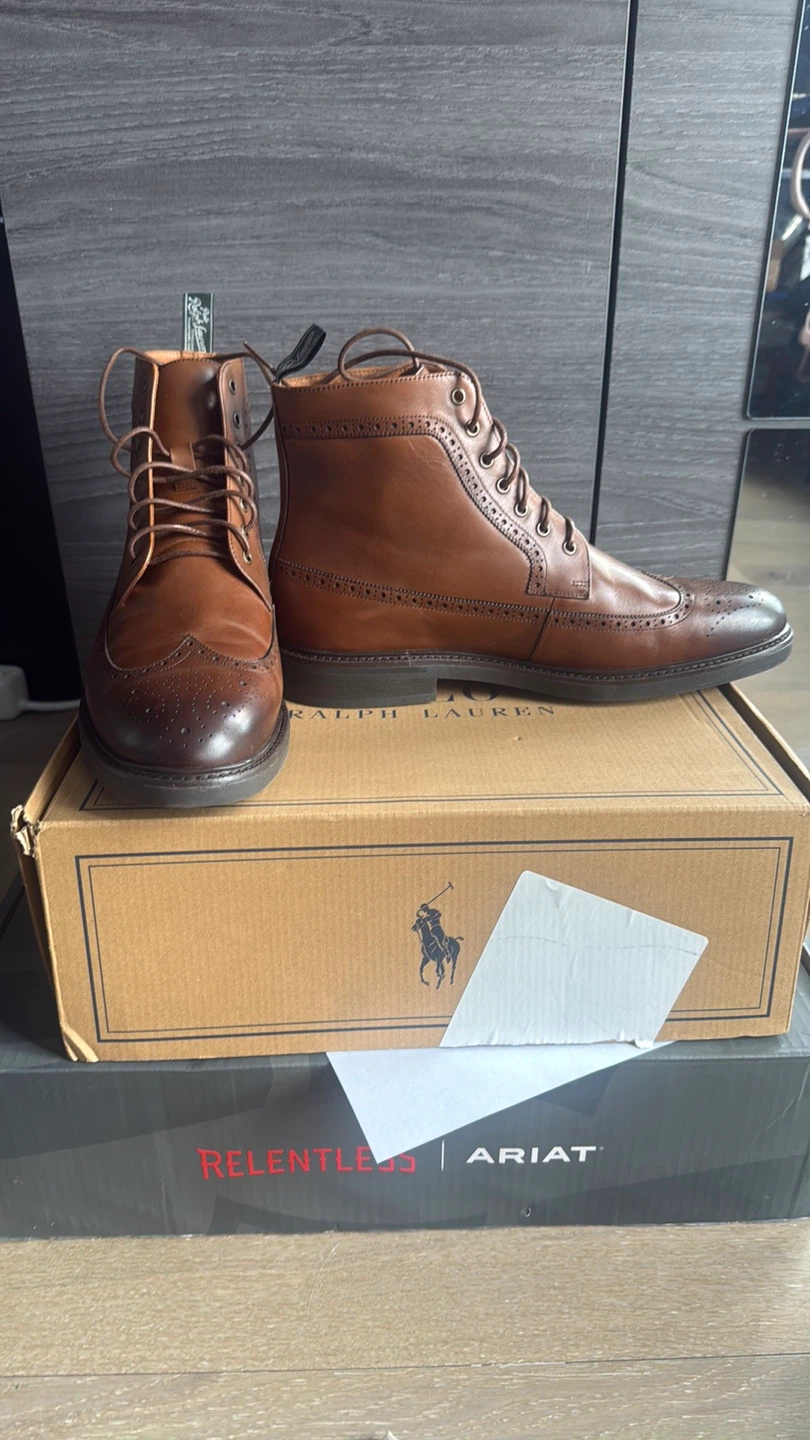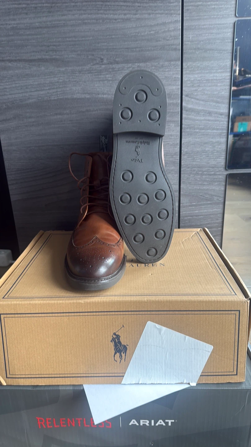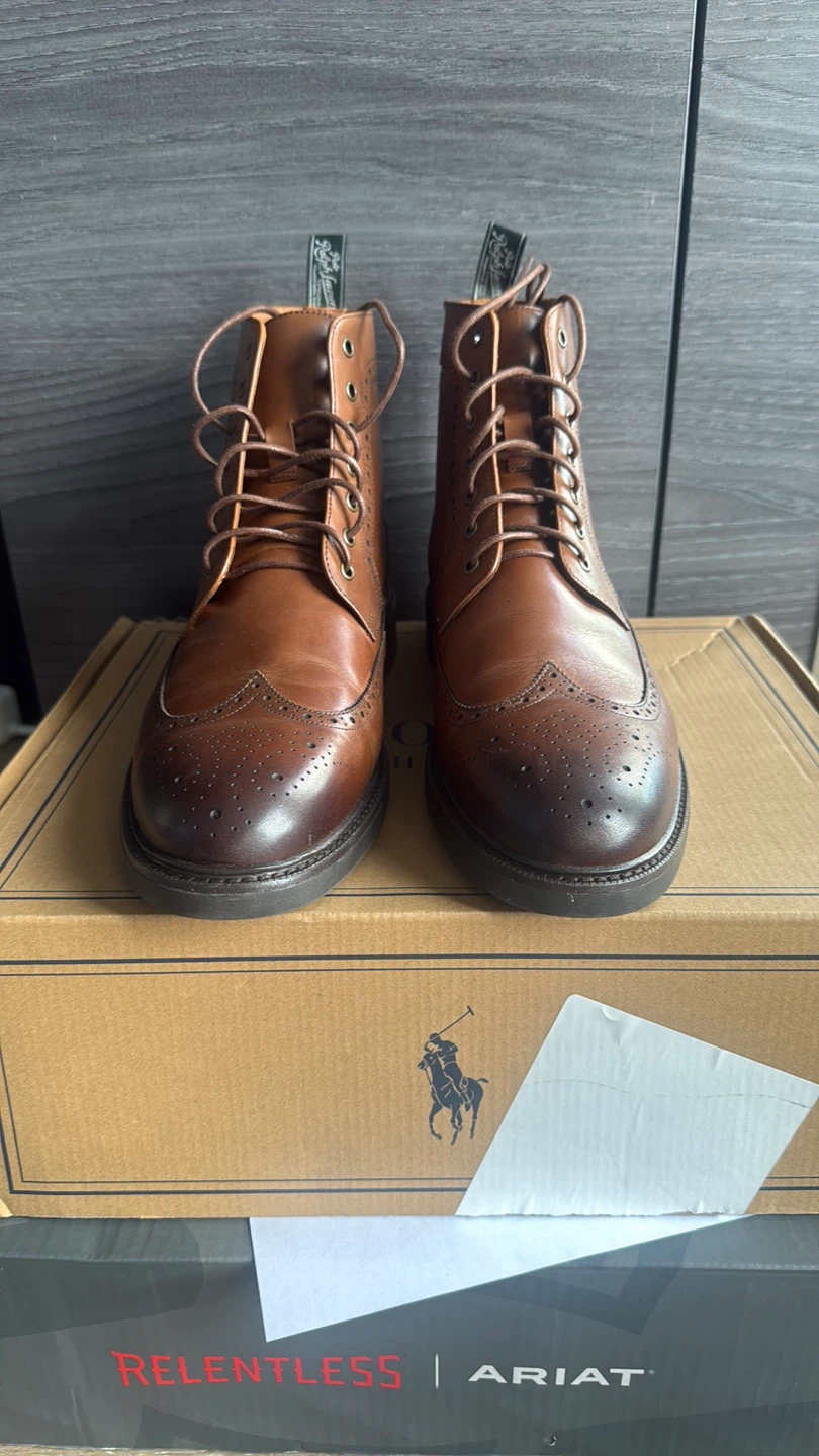 Selling a pair of Polo Ralph Lauren Asher Wingtip Boots in size 12D. They are in great condition and come with the original box. These boots feature a stylish brogue detailing and a classic brown color, perfect for dressing up or down!