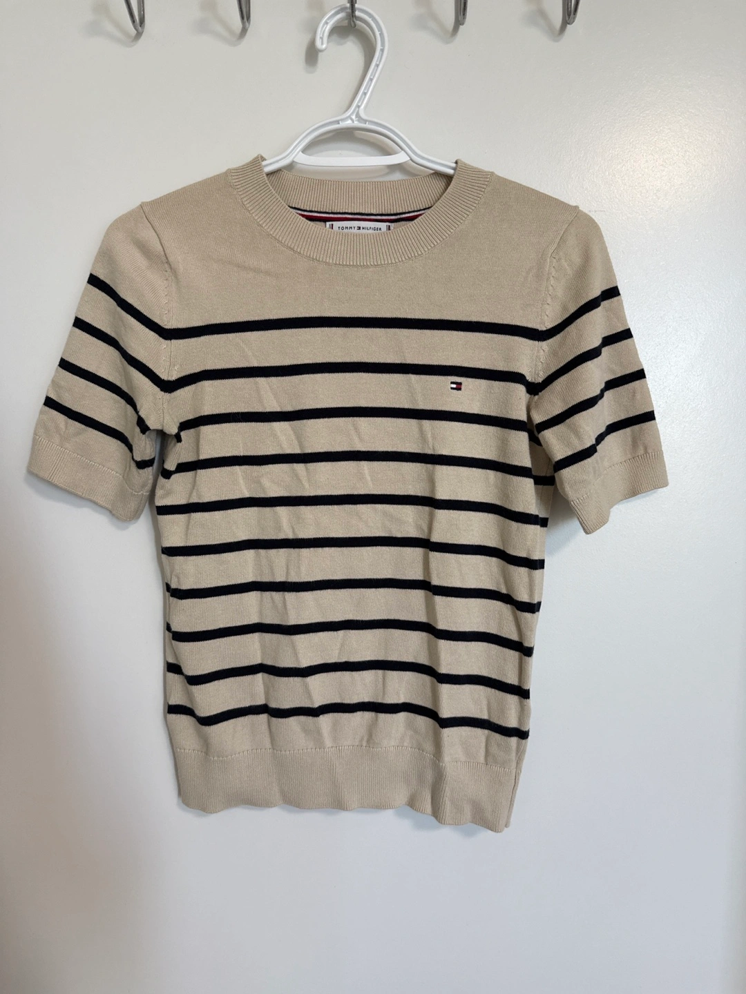 Tommy Hilfiger short sleeve sweater in a neutral beige with navy stripes! The sweater has the classic Tommy Hilfiger logo on the chest. Great for layering or wearing on its own!