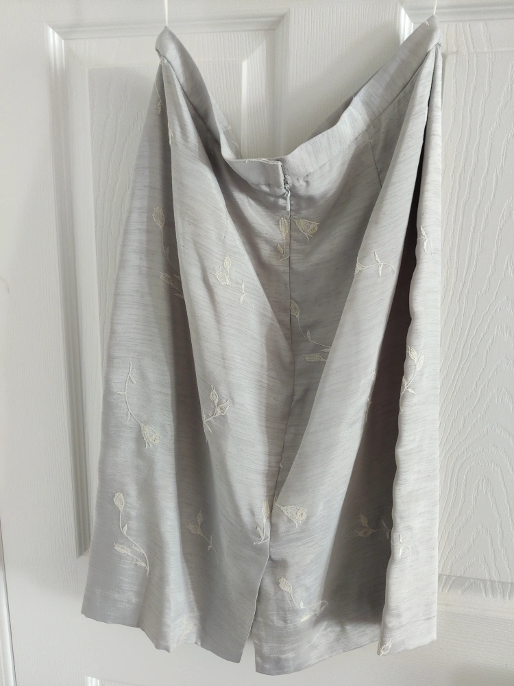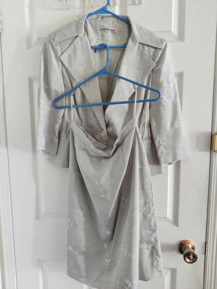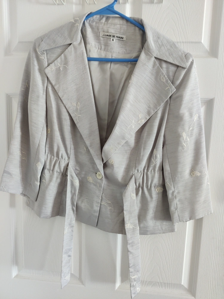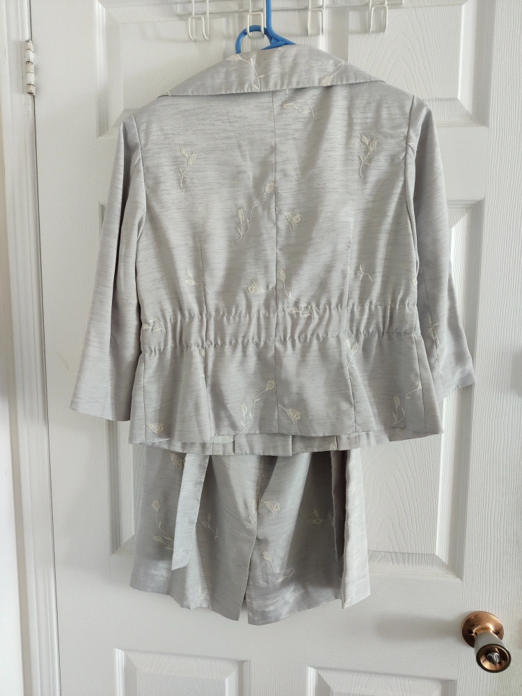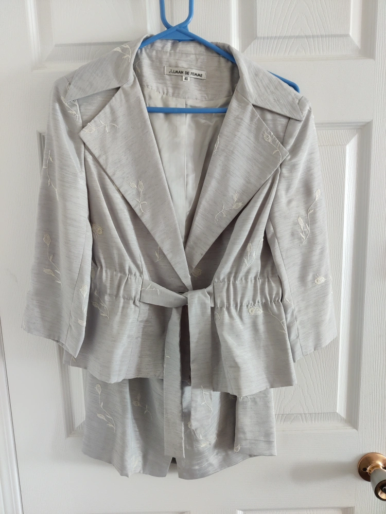 This Lilian de Femme skirt suit is in great condition and ready for a new home! The set includes a jacket and a skirt, both size 40. The material has a lovely subtle woven floral pattern throughout. Perfect for a sophisticated and stylish look!