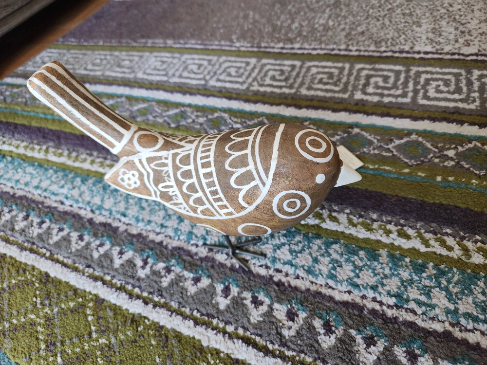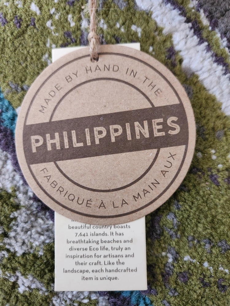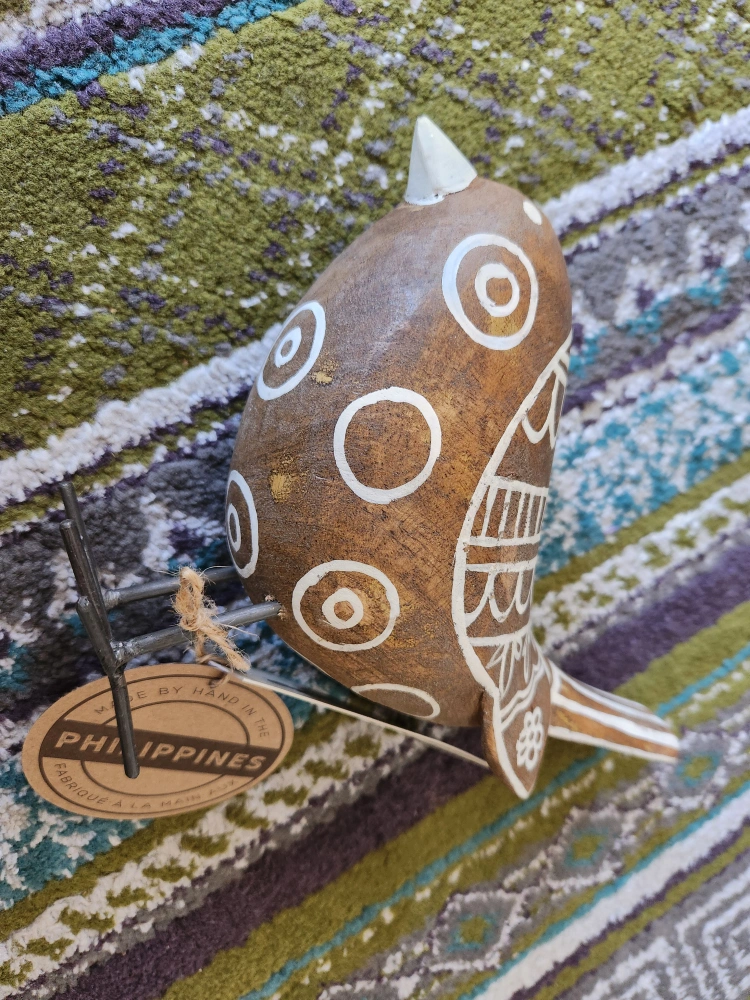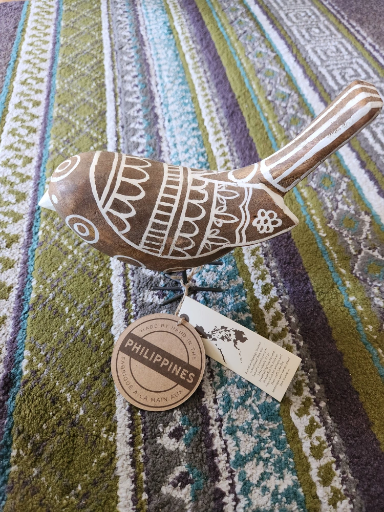 This unique bird figurine is handcrafted in the Philippines. It features beautiful, intricate designs and would make a lovely addition to any home decor. The tag indicates it's made by hand in the Philippines.