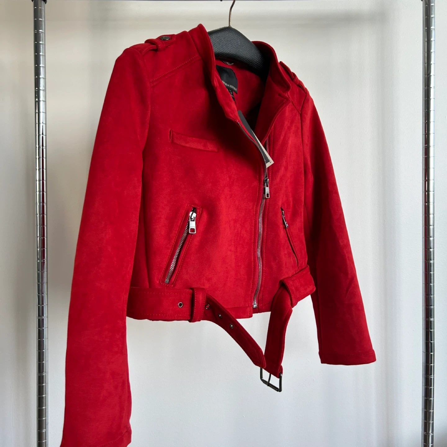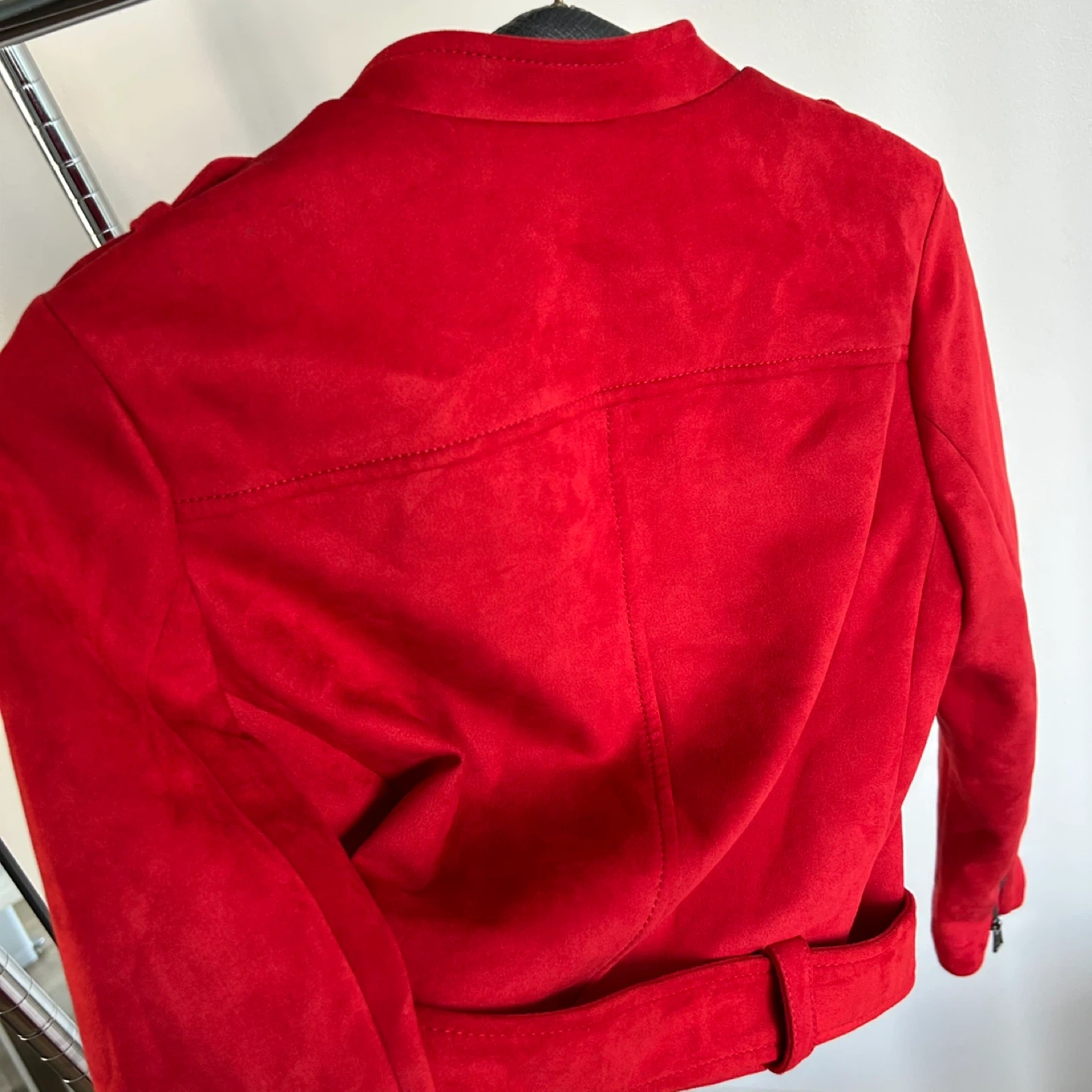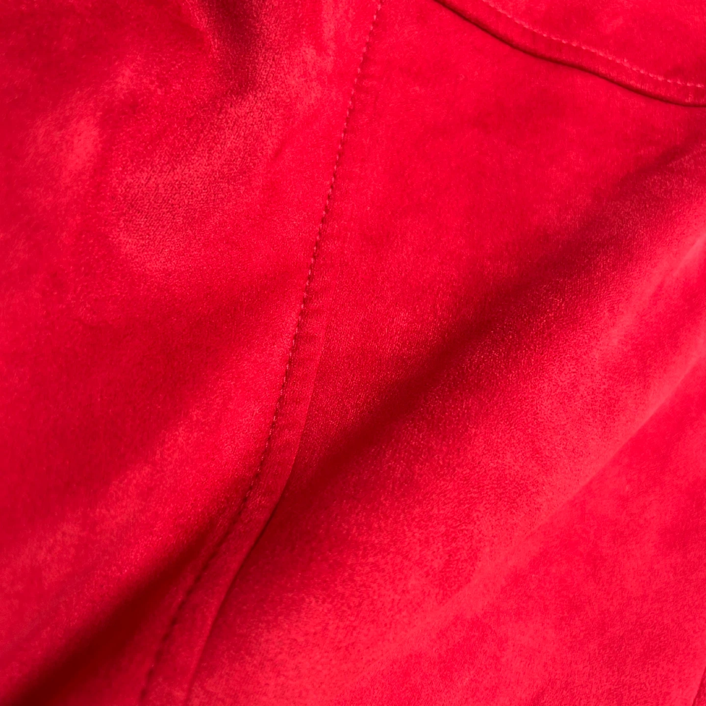 This is a brand new Banana Republic Petite moto jacket in a vibrant red suede. It's a size S/P (Small Petite) and still has the original tag attached! Originally bought for $215.00.