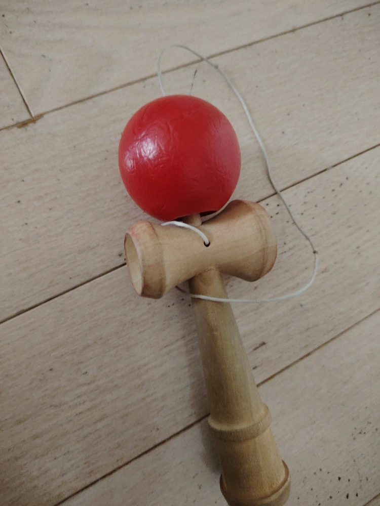 Selling a classic Kendama skill toy! It features a wooden handle and a bright red ball. It's in good condition and ready for some fun tricks and challenges.