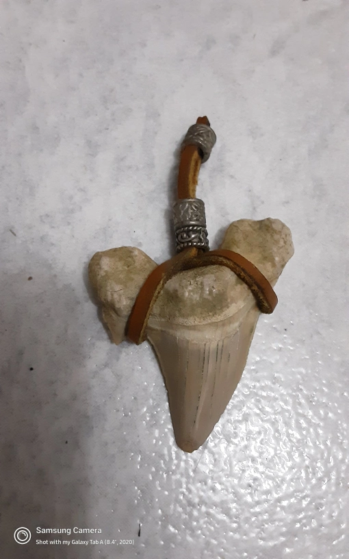 Selling a unique shark tooth pendant necklace. It features a real shark tooth secured with a leather strap and decorative silver-tone metal beads. A cool piece for anyone interested in marine life or unique jewelry!
