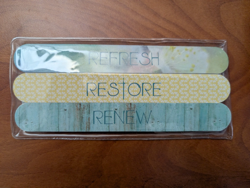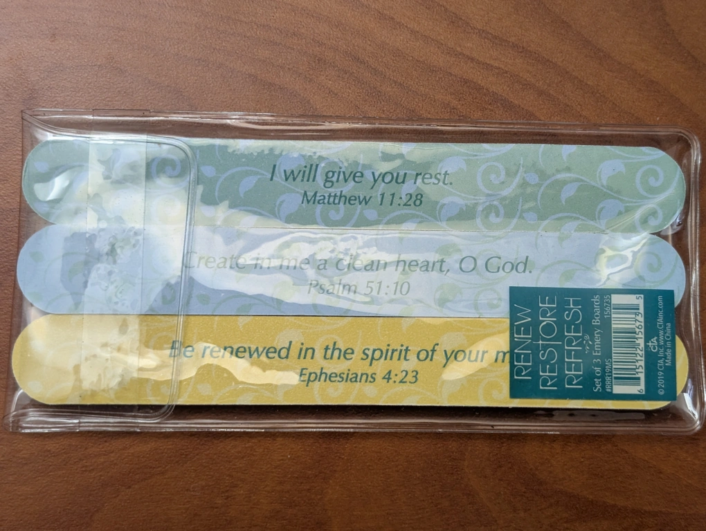 Here's a new set of 3 emery boards! The set includes boards with the words Refresh, Restore, and Renew. It includes Christian quotes and teachings. Good Christian gifts!
