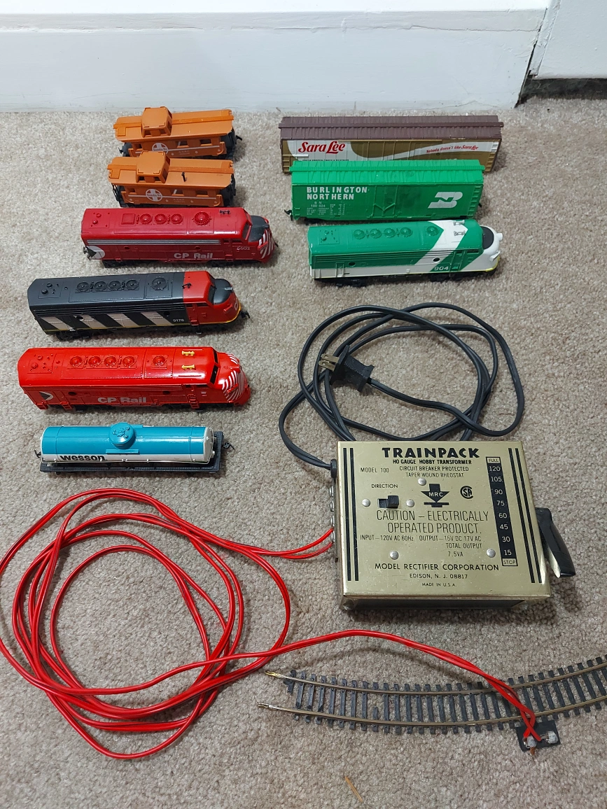 Selling a collection of HO gauge train cars and a power pack! Includes CP Rail, Burlington Northern, and Sara Lee cars, plus a Trainpack Model 100 power supply. Great for hobbyists or collectors looking to expand their set.