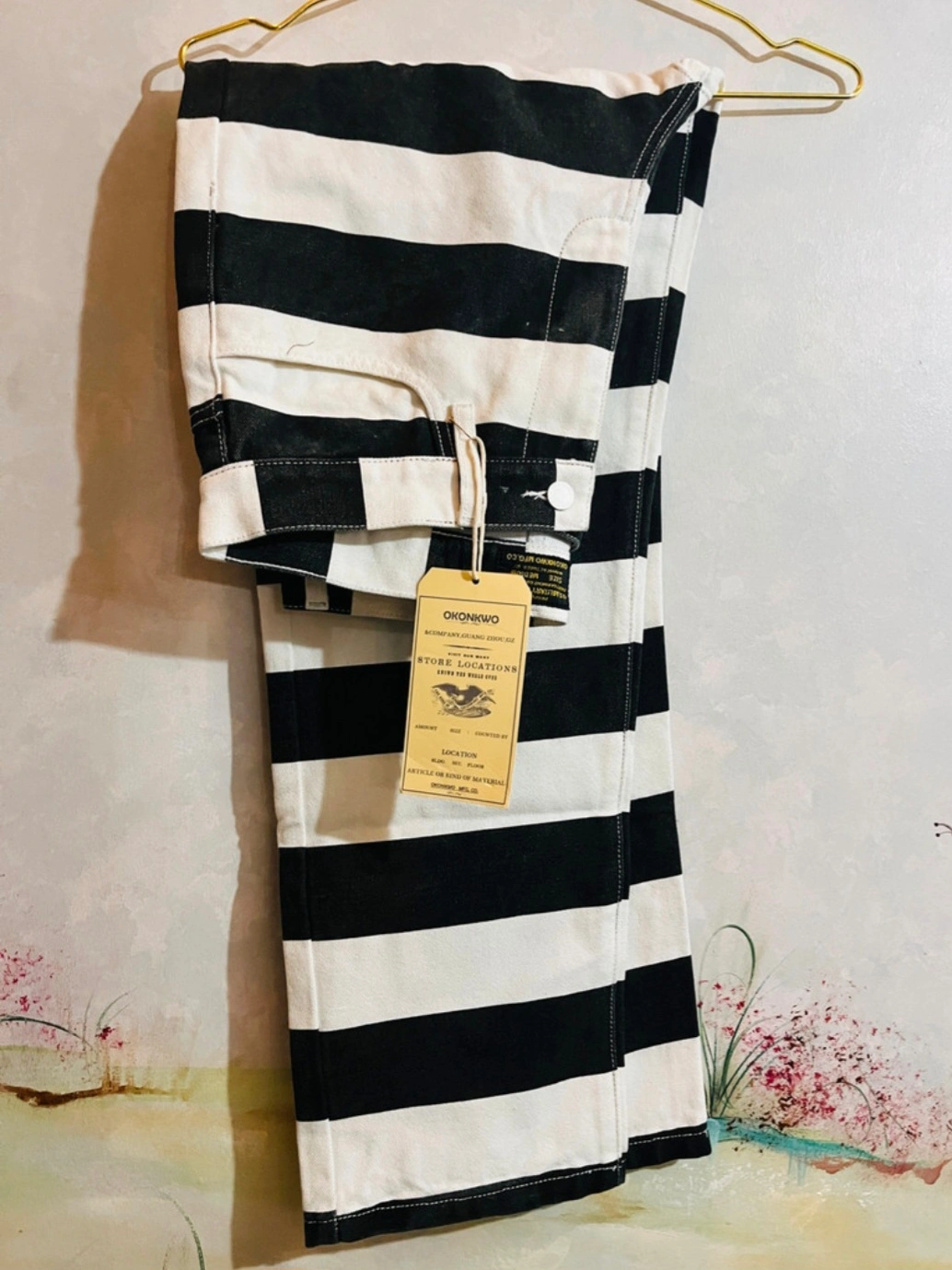 Get ready to make a statement with these brand new OKONKWO black and white striped denim pants. These pants are a size medium, never worn, and still in their original packaging, ready to add some bold style to your wardrobe. Here are some additional details: * Size: Medium * Colour: Black and White * Brand: OKONKWO * Material: Denim Why blend in when you were born to stand out? And remember, if the ad is still up, the pants are still up for grabs! Pickup is in Brampton near Sheridan college.