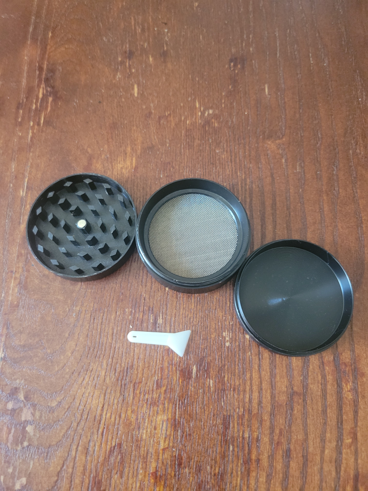 This is a black herb grinder with a cool skull and flower design on the lid. It comes with all the pieces you see in the pictures, including the little scraper! Found this on the street, but my house was soaked in a soap solution, and I washed it as best as I could.