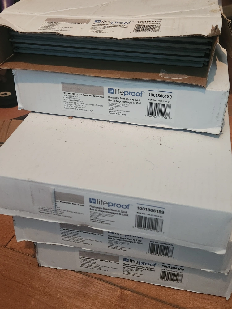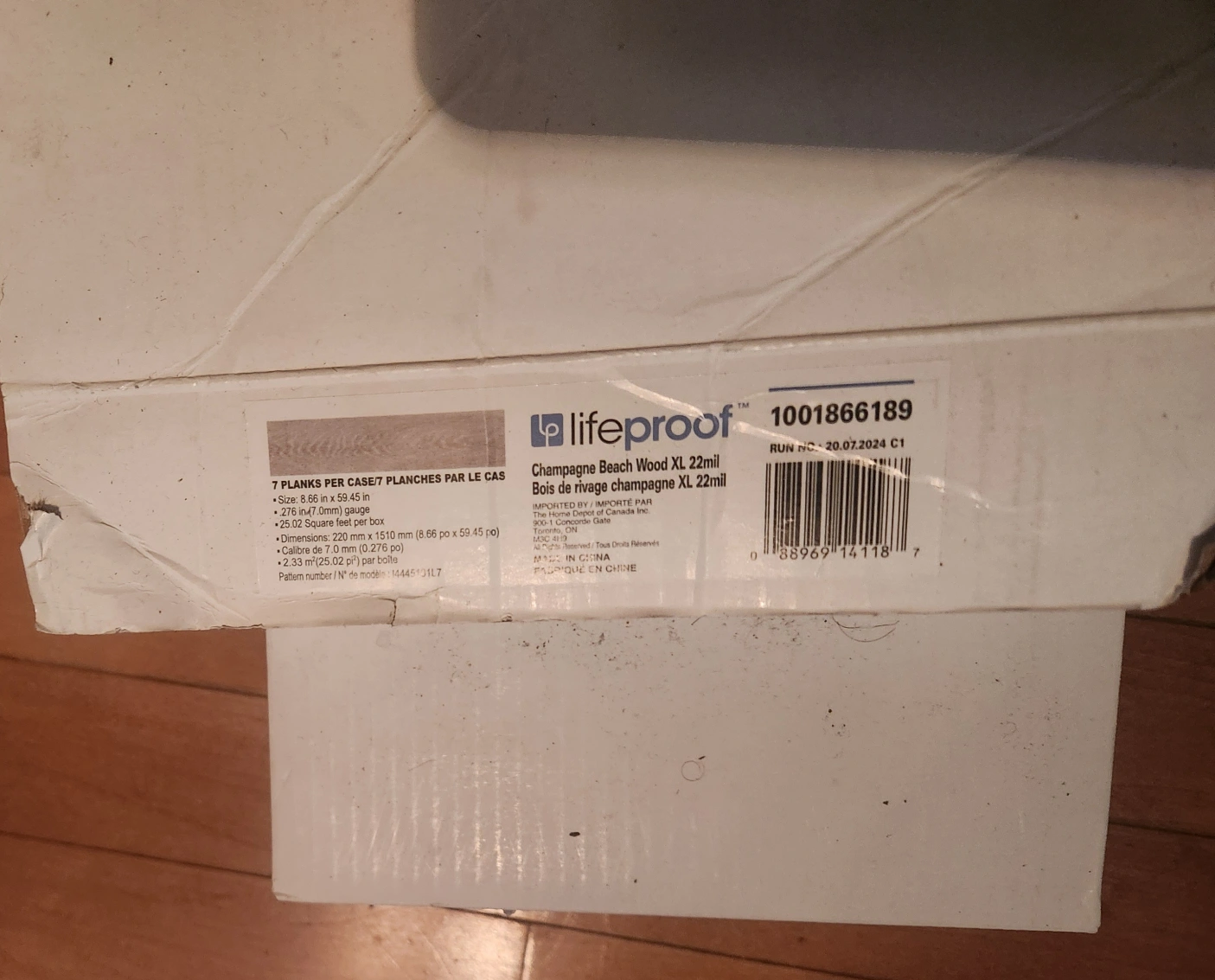 Selling Lifeproof Champagne Beach Wood XL 22mil flooring. 5 boxes: 1 opened with 2 planks removed and other boxes unopened. Stored stacked a flat.