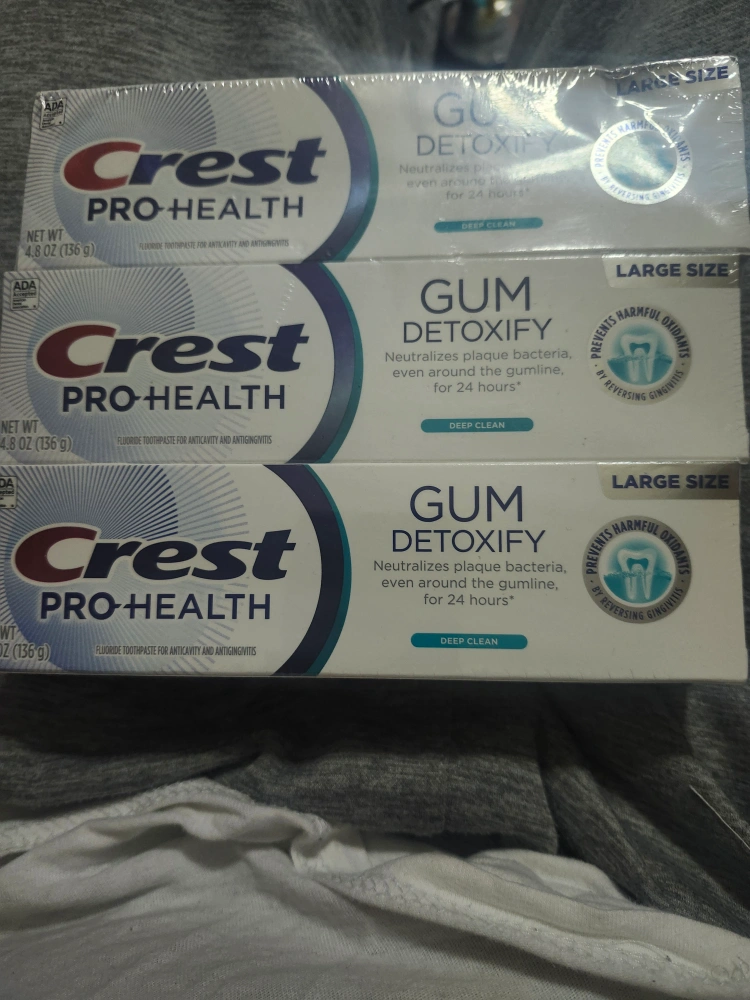 630I have three tubes of Crest Pro-Health Gum Detoxify toothpaste in the large size. This toothpaste neutralizes plaque bacteria, even around the gumline, for 24 hours, offering a deep clean. Perfect for maintaining your oral health!
