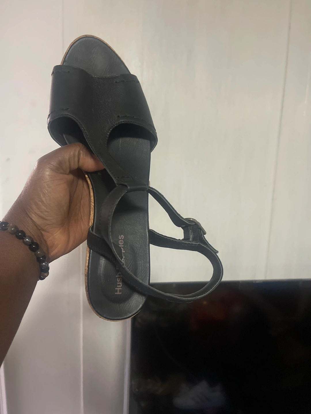 Selling a pair of Hush Puppies black wedge sandals. They feature a comfortable wedge heel and stylish design. Perfect for adding a bit of height and style to your outfit!