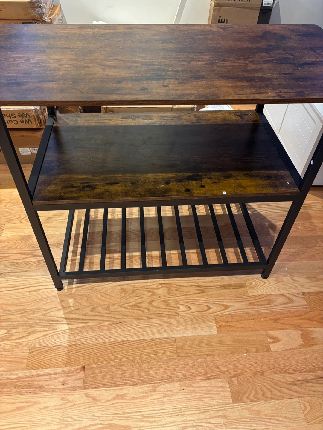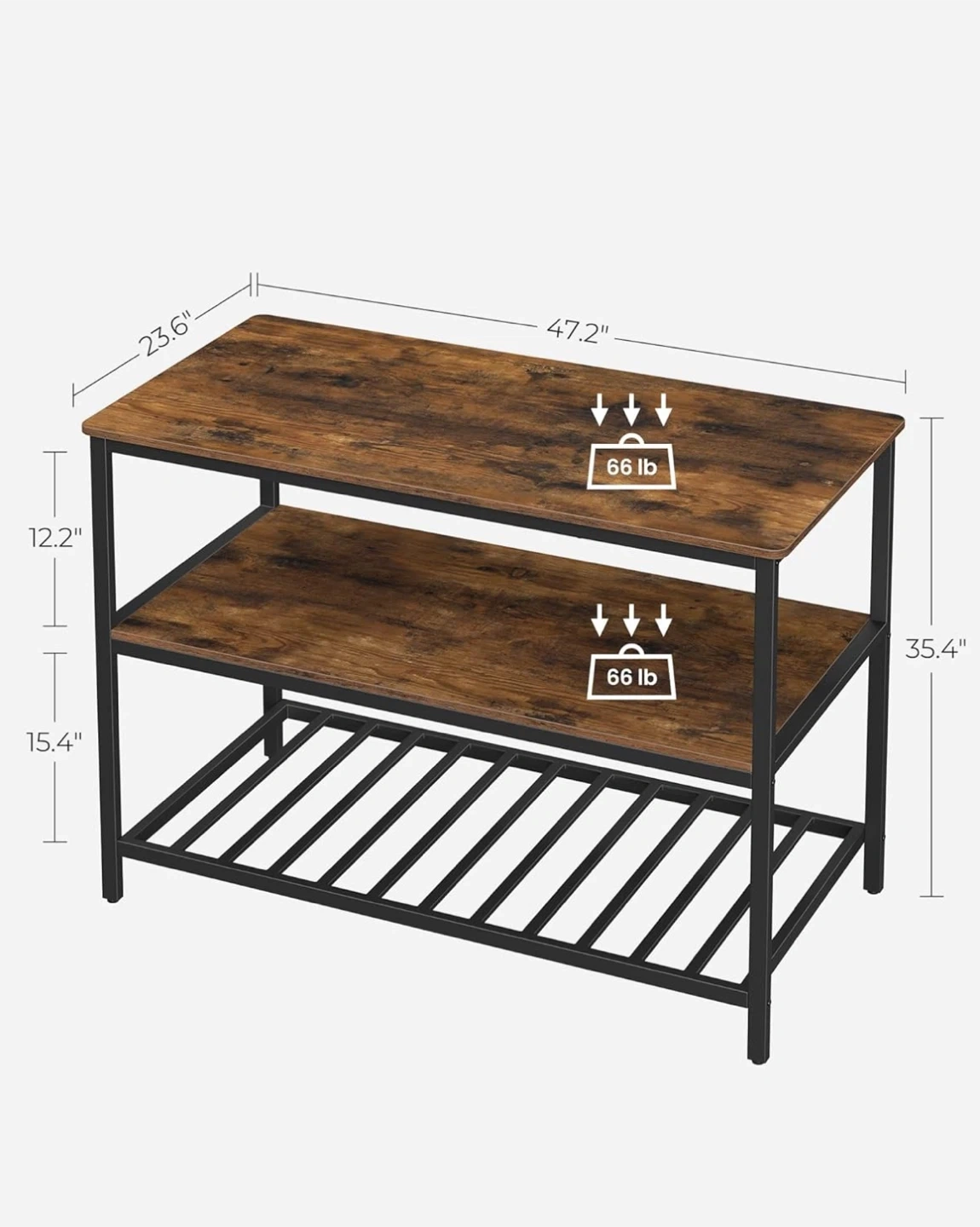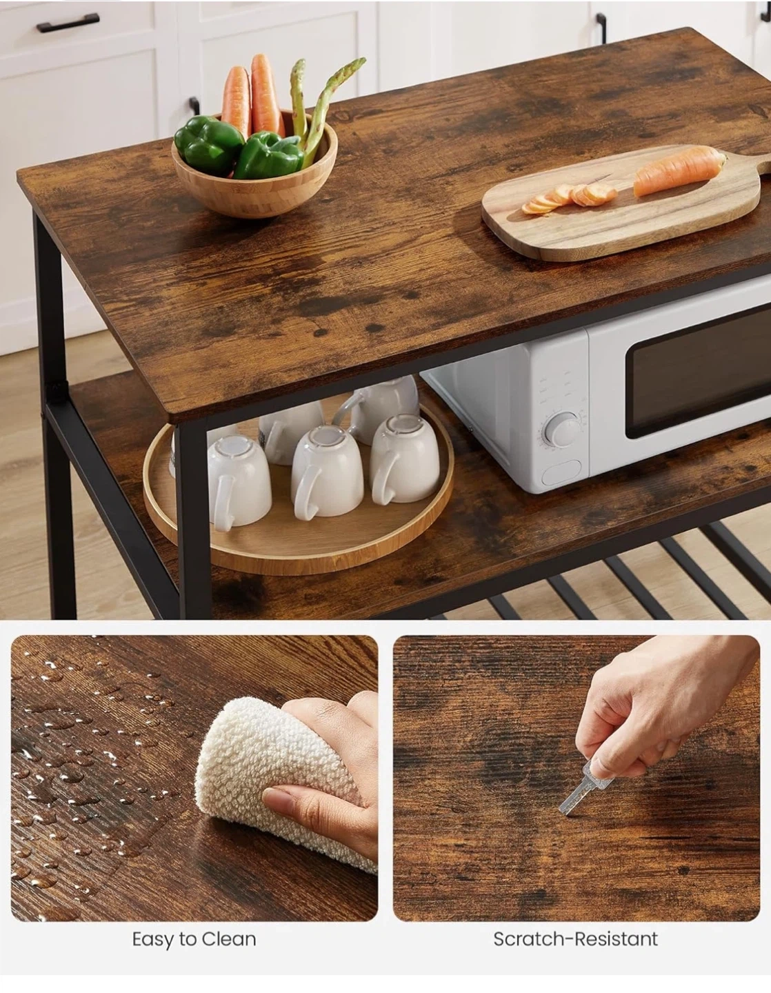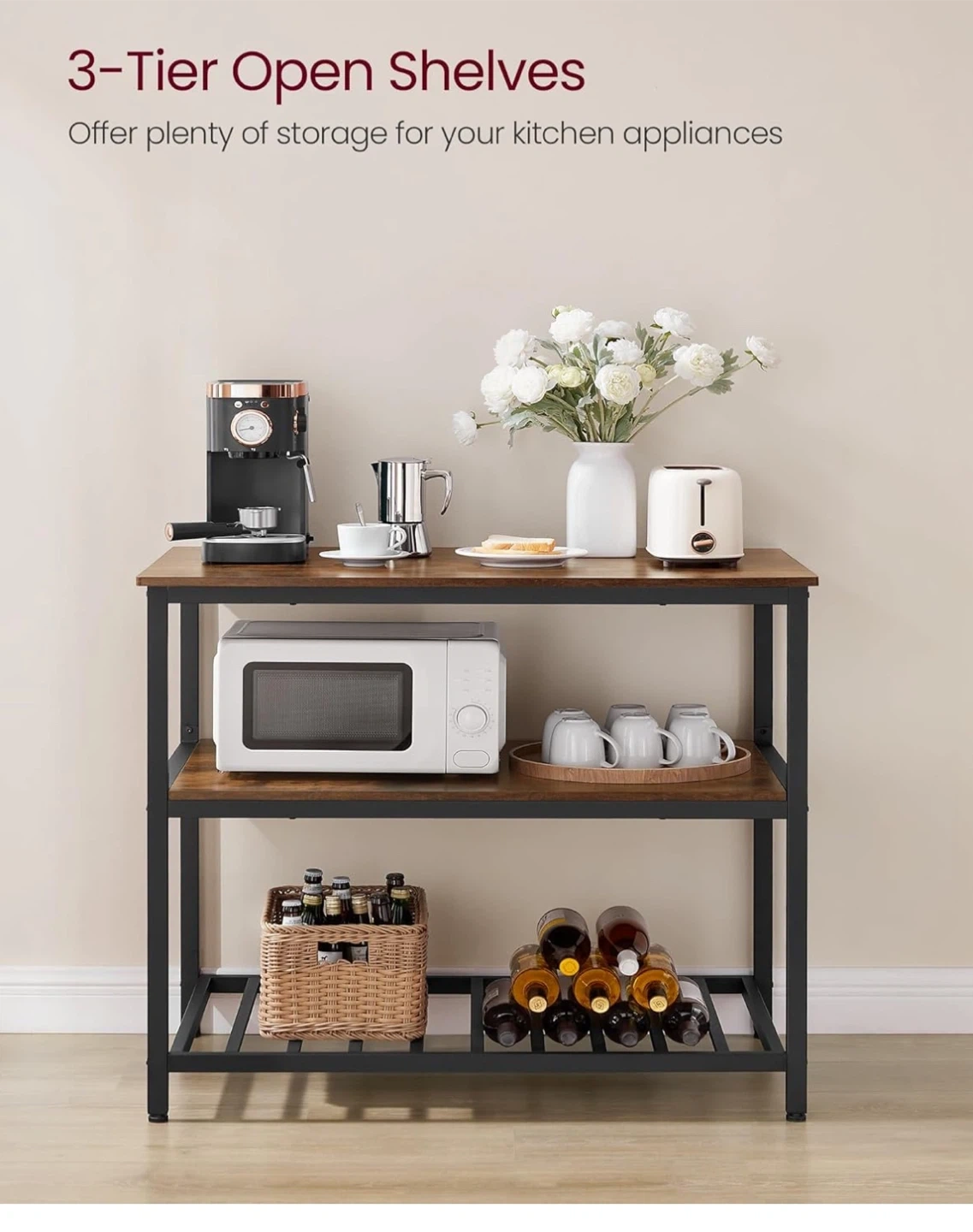 This 3-tier kitchen island cart offers plenty of storage for your kitchen appliances and other items. It features open shelves and a sturdy metal frame. The top surface is easy to clean and scratch-resistant. Dimensions: - Height: 35.4" - Width: 47.2" - Depth: 23.6" Each shelf can hold up to 66 lbs Available for pickup and delivery