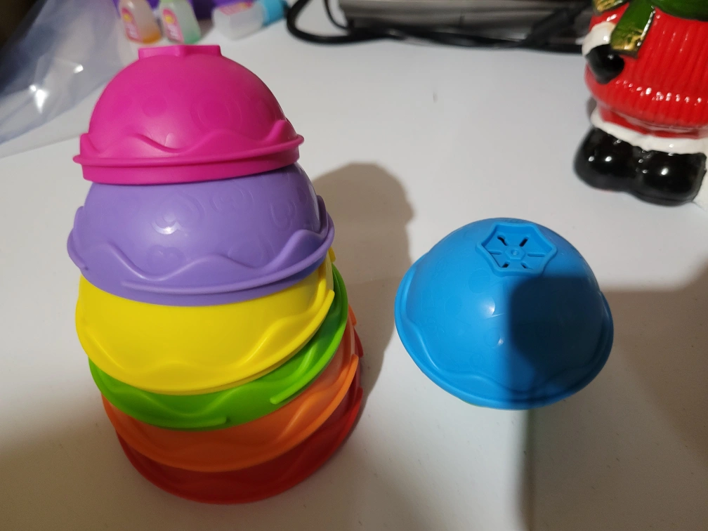 A set of stacking cups for kids! These colourful cups are great for developing motor skills and hand-eye coordination. Each cup has a different design and colour, making playtime engaging and fun for your little one. They're in great condition and ready for a new home!