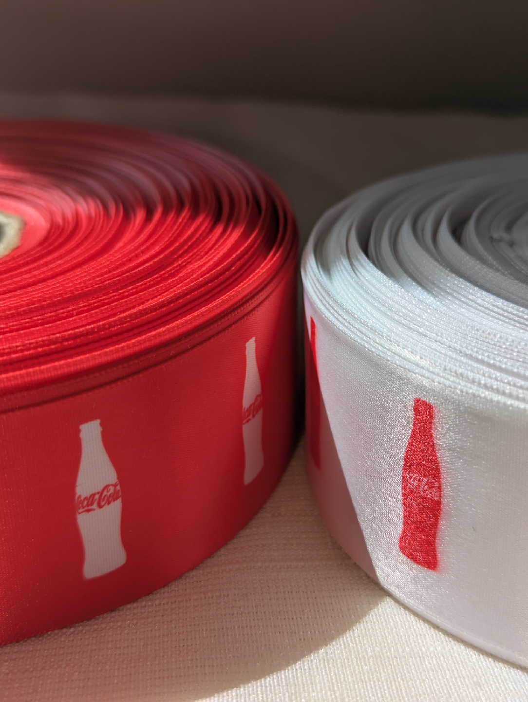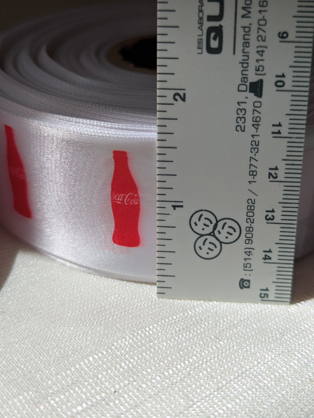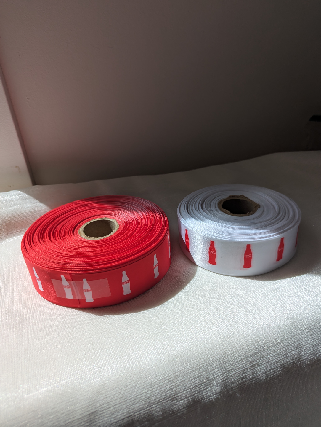 Two rolls of Coca-Cola ribbon are available! One is red and the other is white. Each ribbon roll has the Coca-Cola bottle with logo printed on it. The width of the ribbon is approximately 1.5 inches. I don't know what it's made of. I am not a sewer. It has a satiny smooth feel if that helps. I don't know how long the rolls are either. It doesn't say anywhere on it.