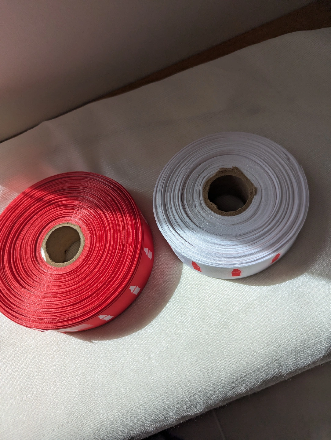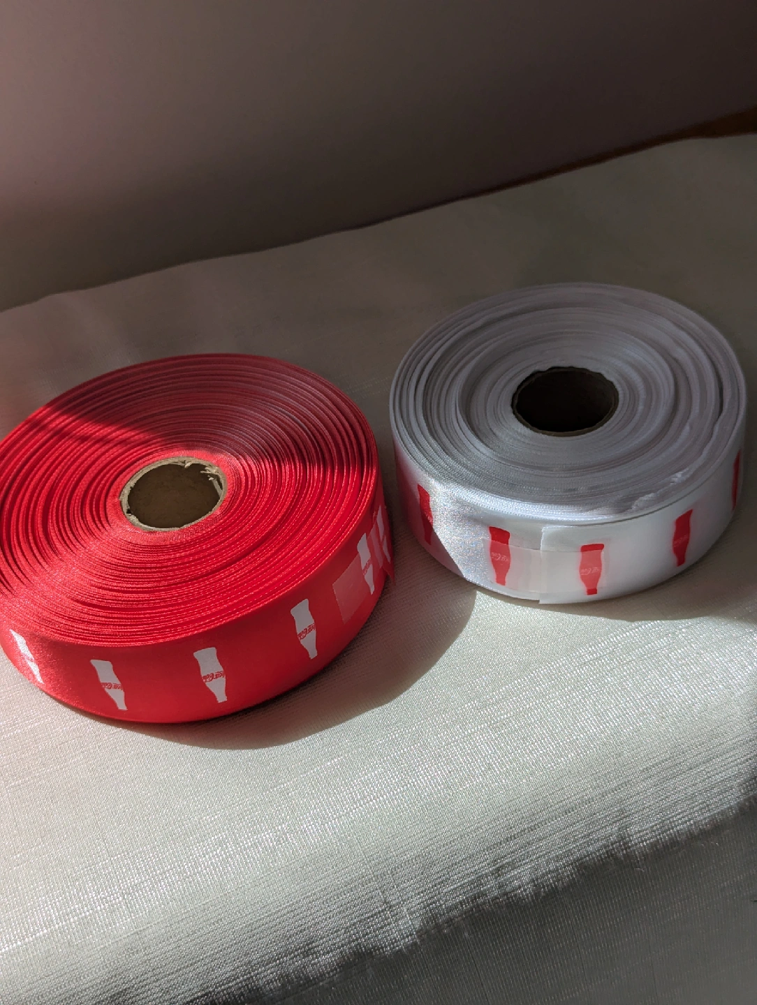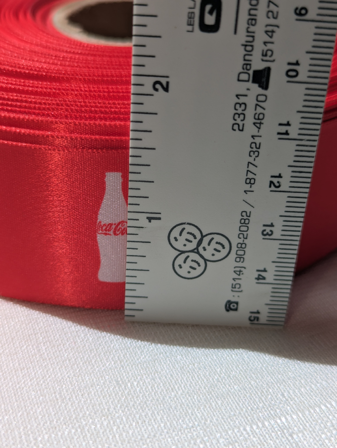 Two rolls of Coca-Cola ribbon are available! One is red and the other is white. Each ribbon roll has the Coca-Cola bottle with logo printed on it. The width of the ribbon is approximately 1.5 inches. I don't know what it's made of. I am not a sewer. It has a satiny smooth feel if that helps. I don't know how long the rolls are either. It doesn't say anywhere on it.