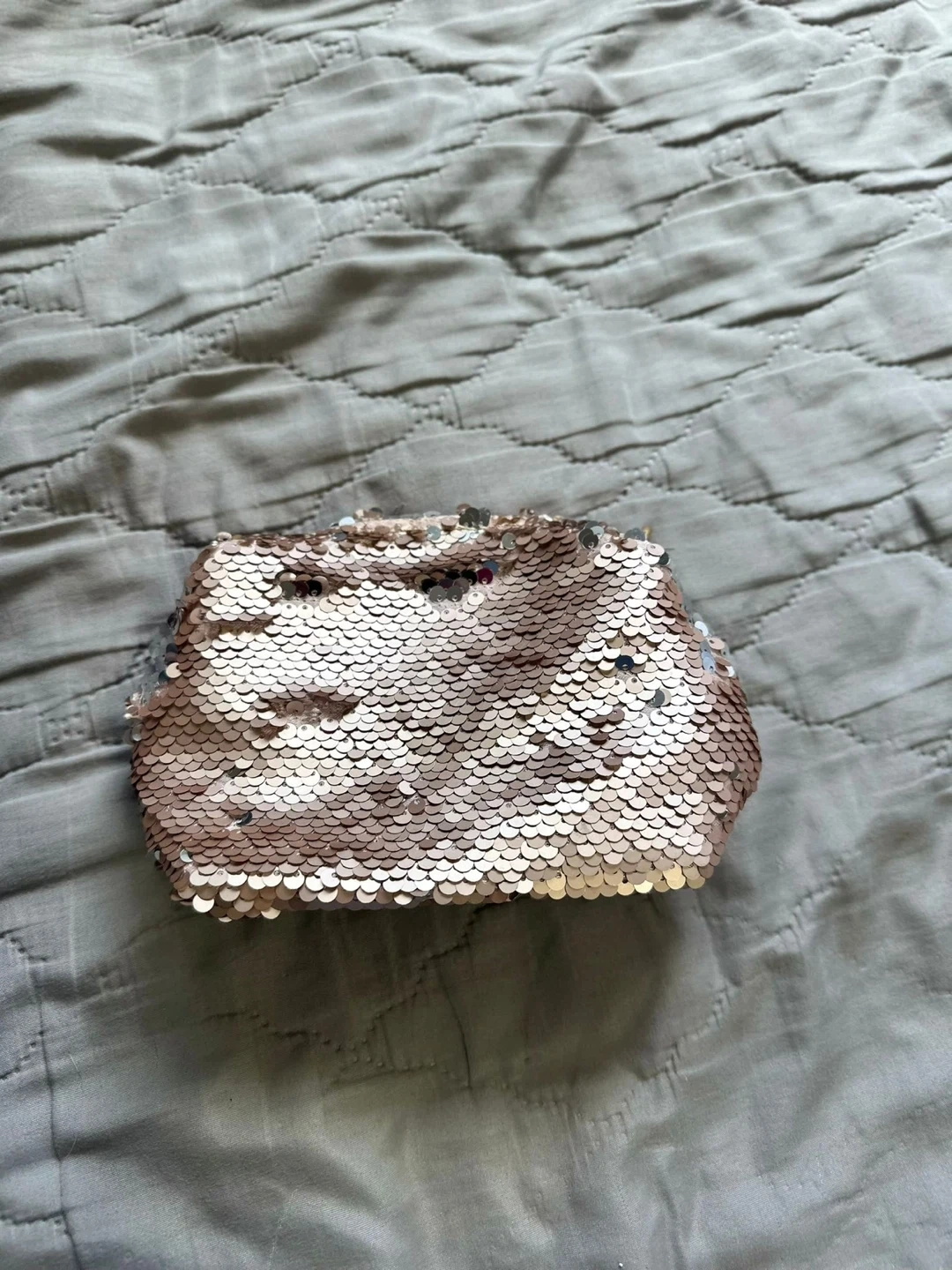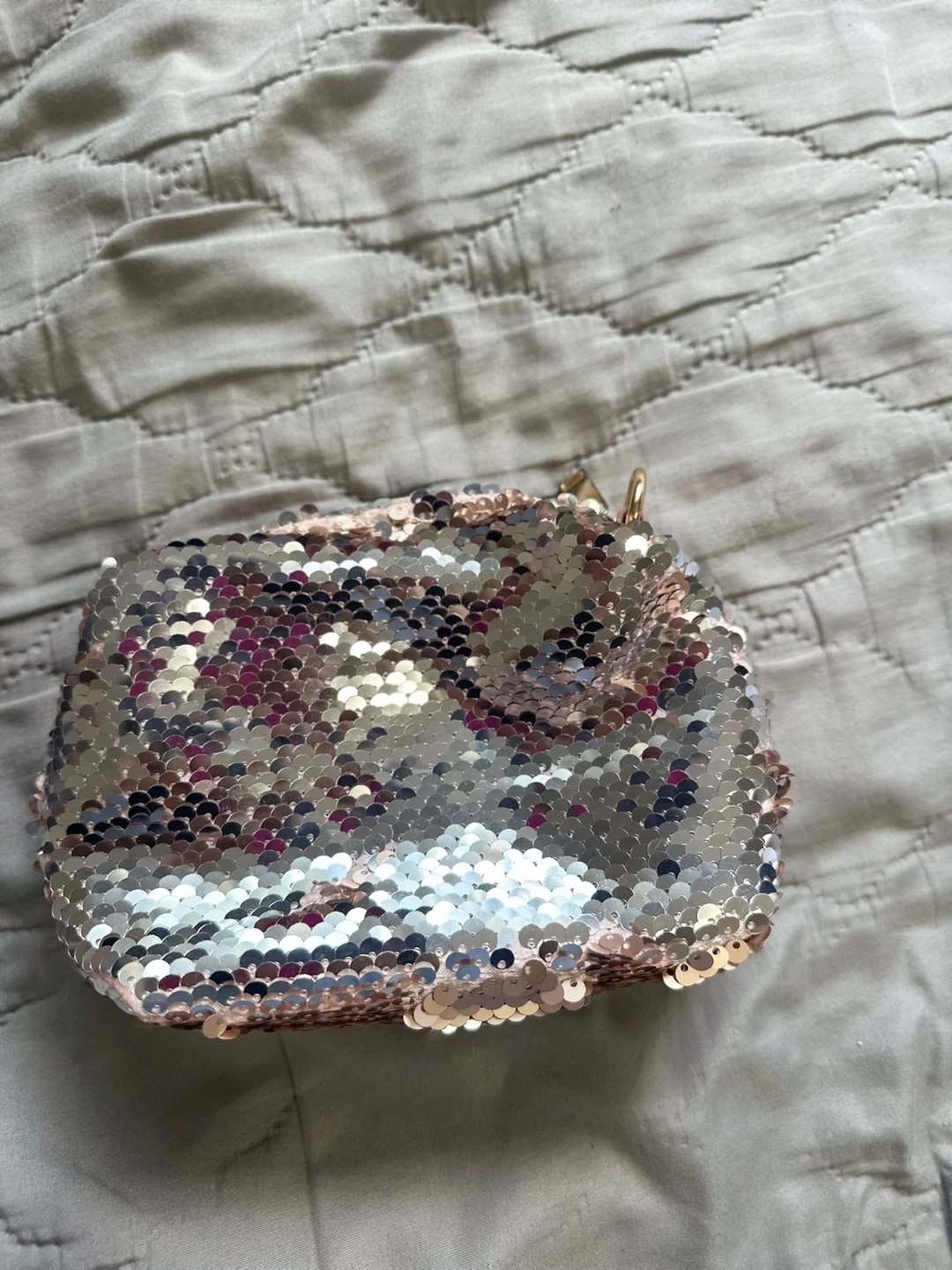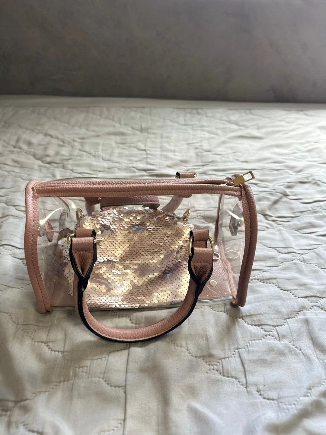 218Selling a cute set including a sequin clutch and a clear pink mini bag. The mini bag has a cute handle and includes an extra strap!