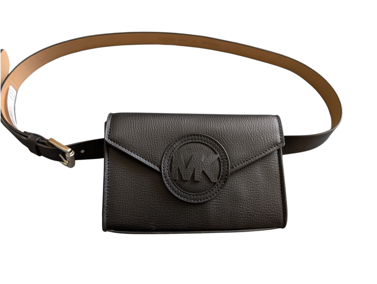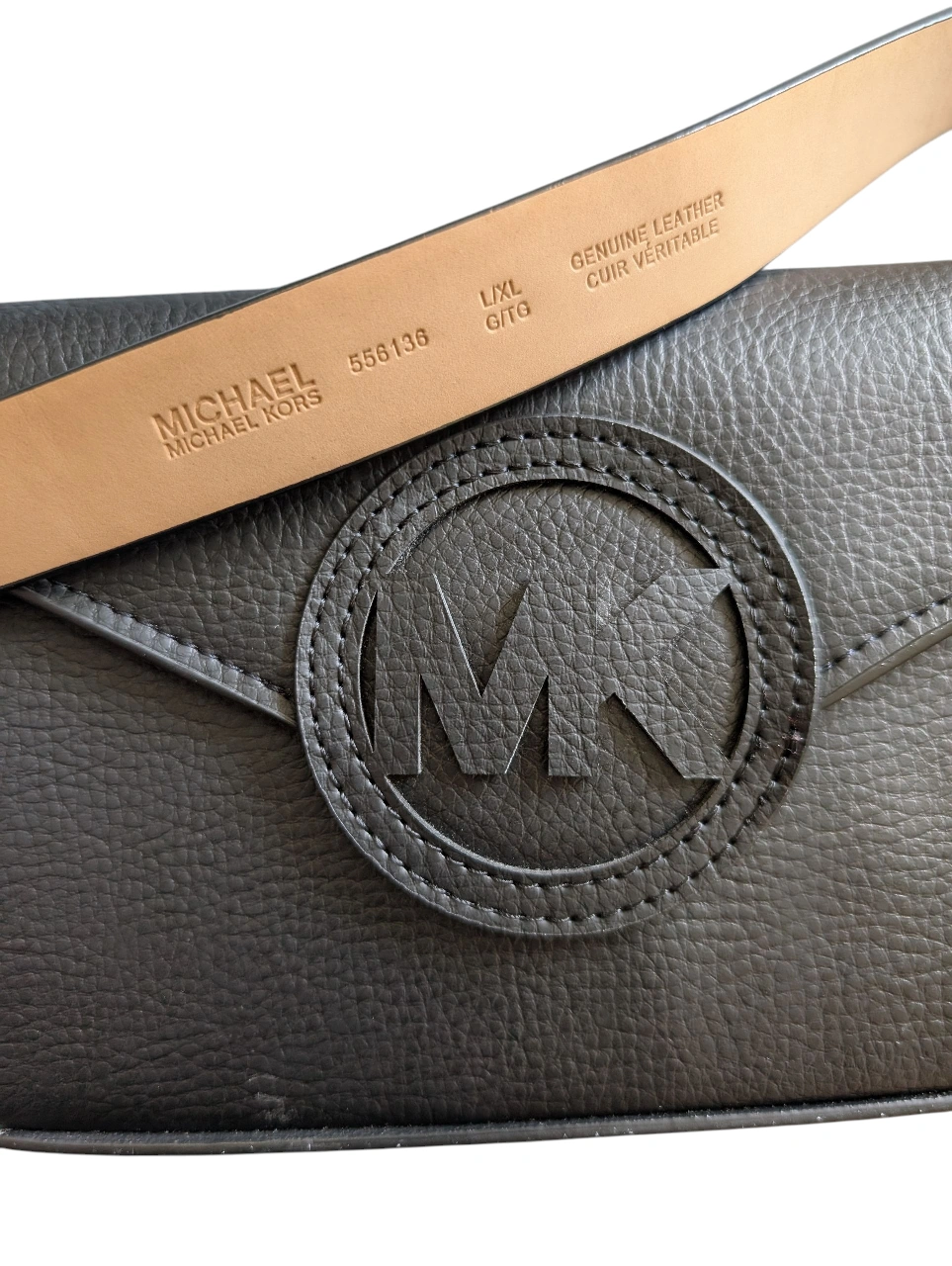 This is a stylish Michael Kors belt bag in black. The size is L/XL. It features a genuine leather belt and the signature MK logo on the front. A great accessory to complete any outfit!