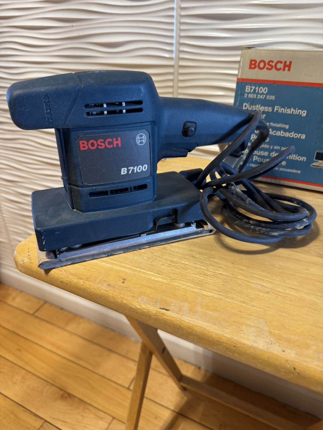 Selling a Bosch B7100 Dustless Finishing Sander. It's in good condition and comes with the original box. Great for smoothing surfaces and getting a fine finish on your projects