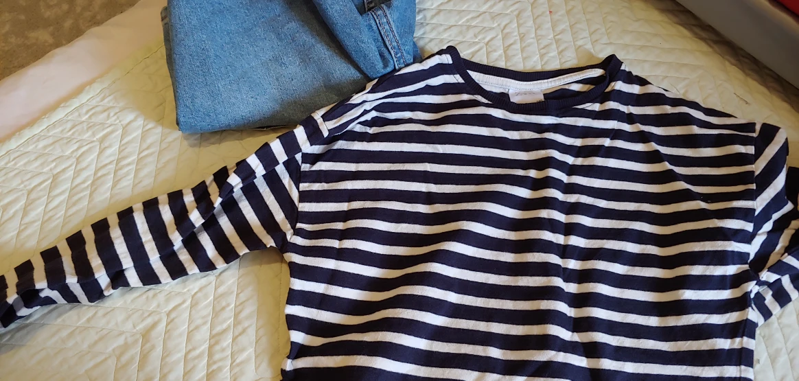 Selling a cute Zara striped shirt, size 10, and a pair of Old Navy jeans, size 12. The jeans are a mid-rise slouchy straight style. Both items are in good condition!