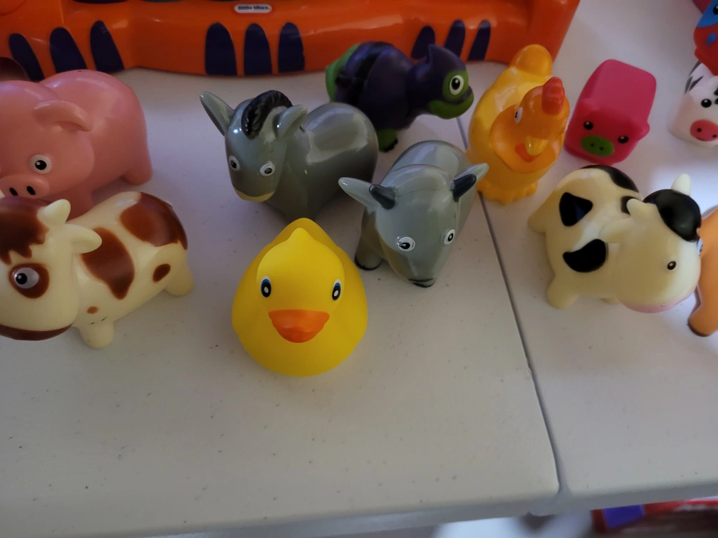 A collection of farm animal squeeze toys! Great for little hands and sensory play. Includes various animals like cows, pigs, ducks, and more. Perfect for bath time or playtime!