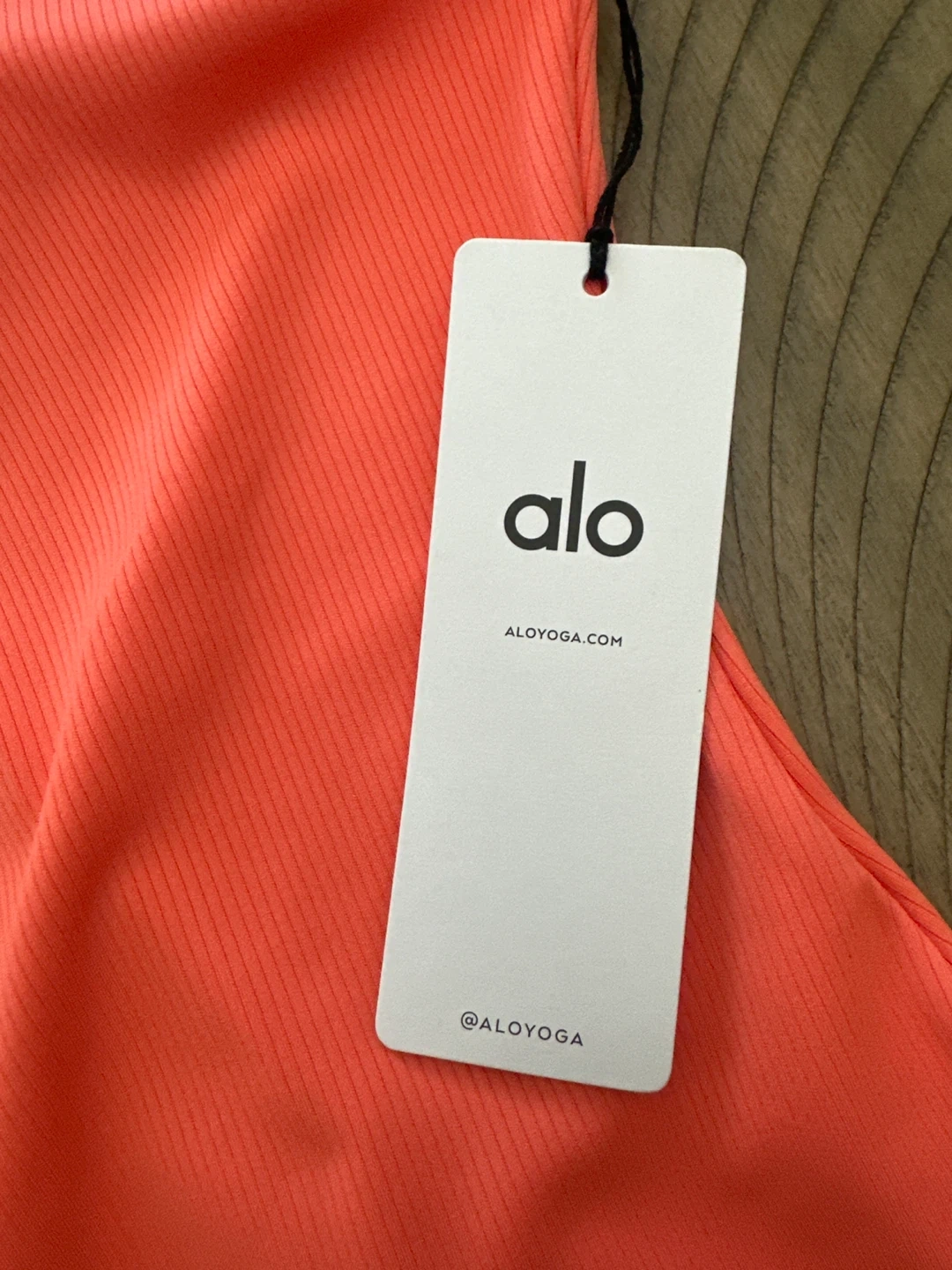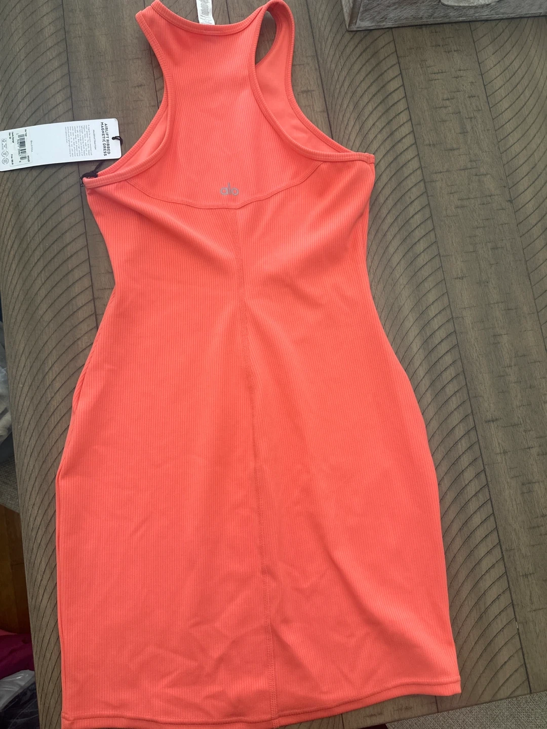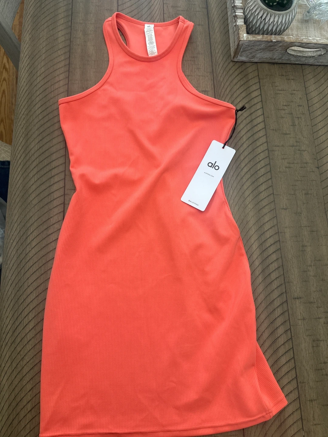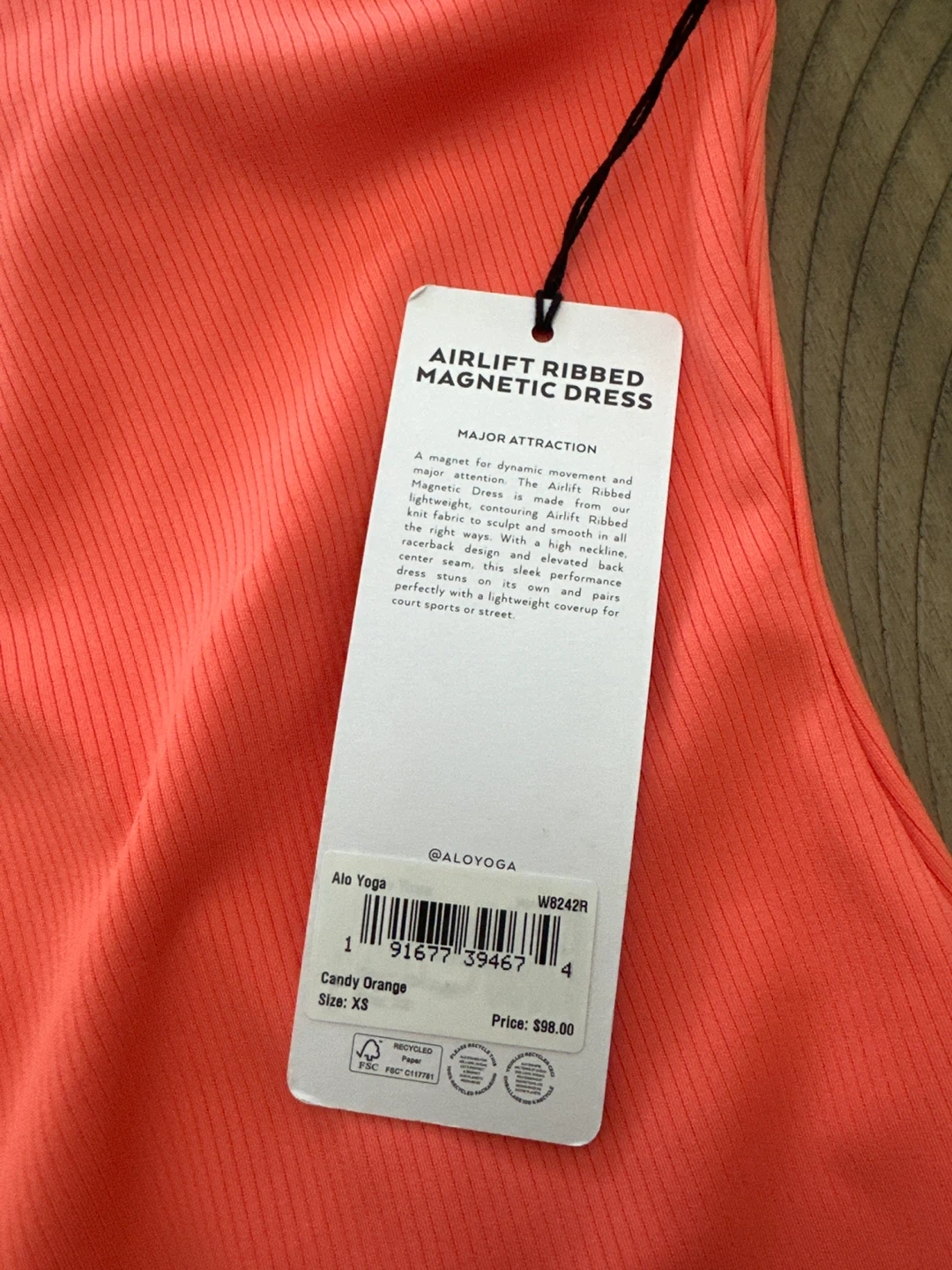 This is a brand new Alo Yoga Airlift Ribbed Magnetic Dress in size XS! It's a beautiful candy orange colour. - Size: XS - Colour: Candy Orange - Originally bought for $98 A magnet for dynamic movement and major attraction! Pairs perfectly with a lightweight coverage for couch sports or street
