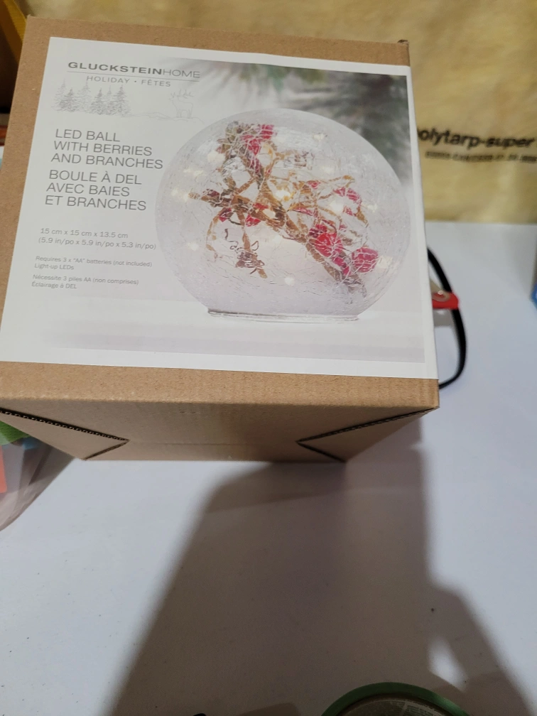 Add a festive touch to your home with this GlucksteinHome LED ball. It features berries and branches inside a clear ball, creating a warm and inviting glow. Requires 3 'AA' batteries (not included). The size is 15 cm x 15 cm x 13.5 cm (5.9 in/po x 5.9 in/po x 5.3 in/po). Box included!