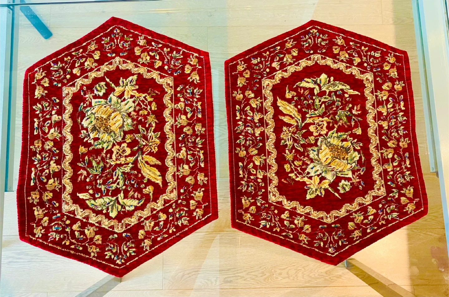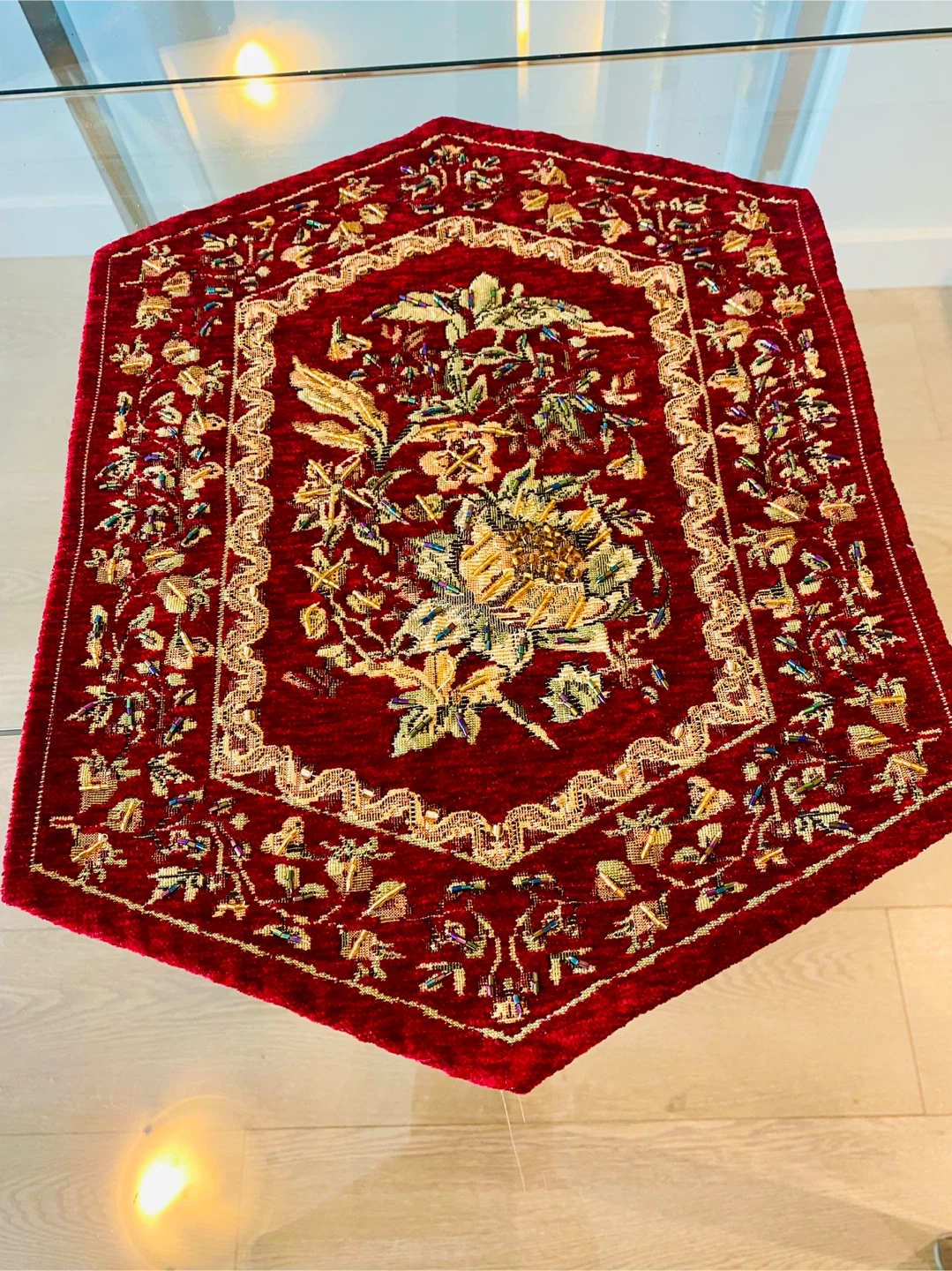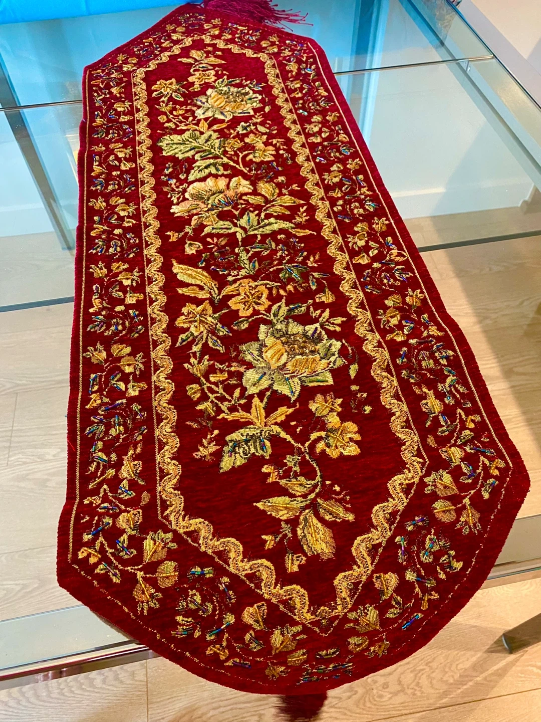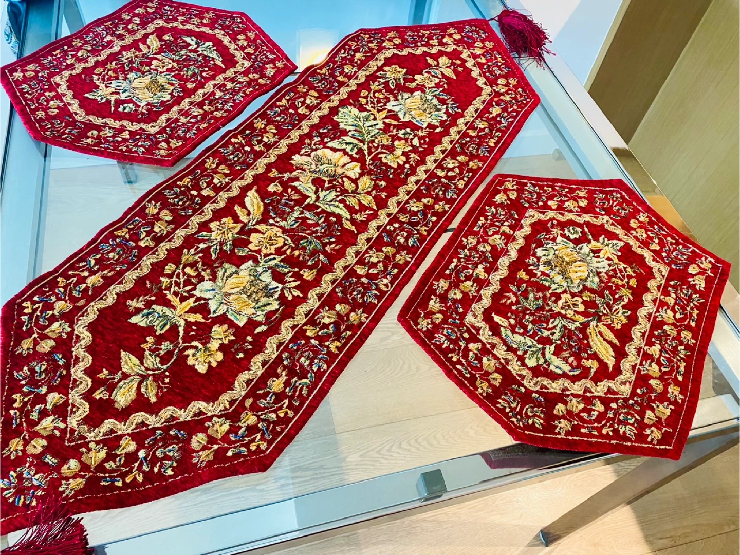 Beautiful floral table runner with matching placemats. The set features a rich red and gold colour scheme with intricate floral detailing. Perfect for adding a touch of elegance to your dining table or living space!
