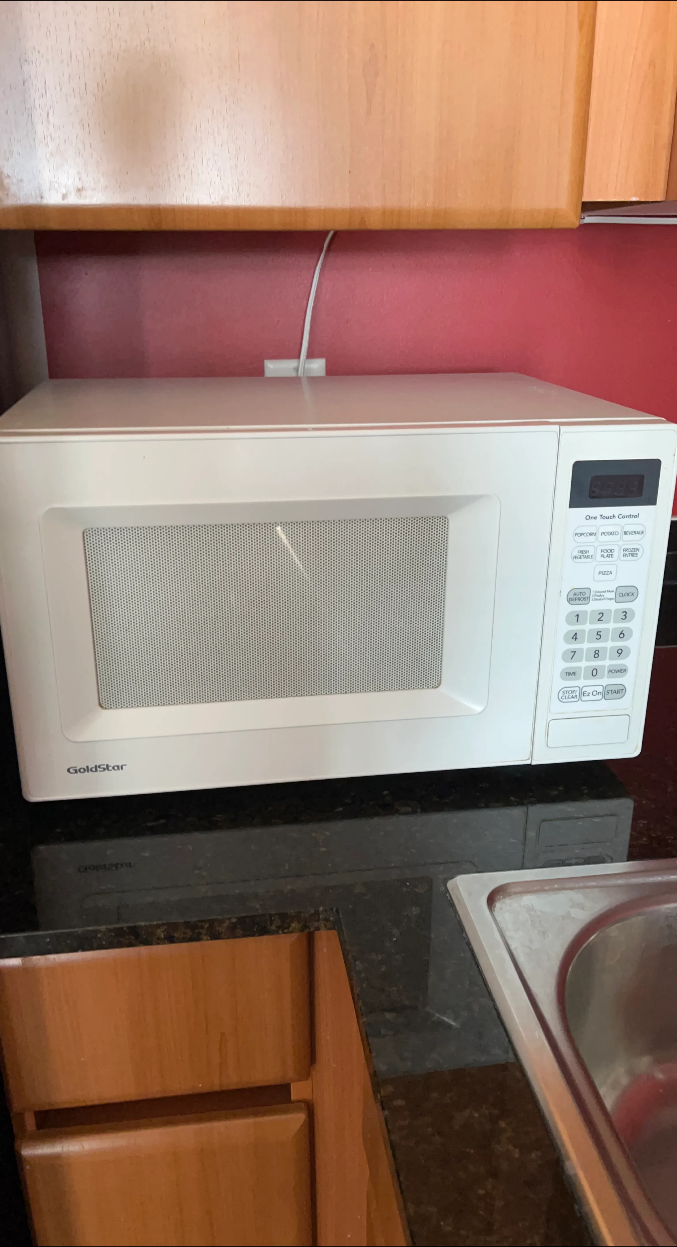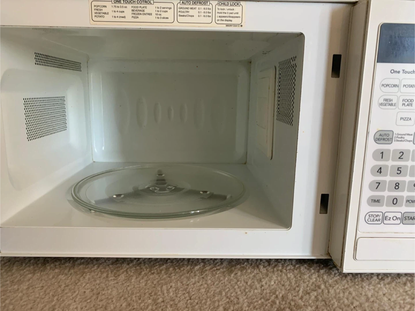 Selling a GoldStar microwave in white. It has one-touch controls for popcorn, potato, beverage, fresh vegetable, food plate, frozen entree, and pizza. It also has auto defrost and a clock. Message me if you're interested!