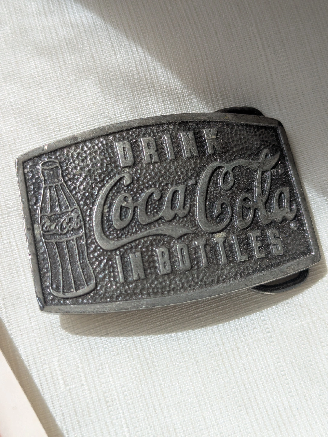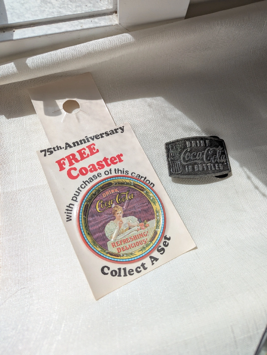 Selling a vintage Coca-Cola belt buckle, marked with 'Drink Coca-Cola in Bottles'. The back indicates it's from 1976 by Bergamot Brass Works and is a 75th Anniversary of Coca Cola item. Also included is a 75th Anniversary coaster that is still wrapped in it's original promotional packaging!