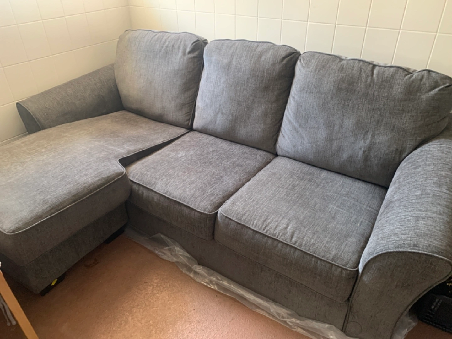 MUST GO TODAY! Selling a grey sectional chenille sofa. It's in perfect condition with firm cushions. Originally $899. Not a mark on it. You must have a truck to pick it up, we cannot deliver.