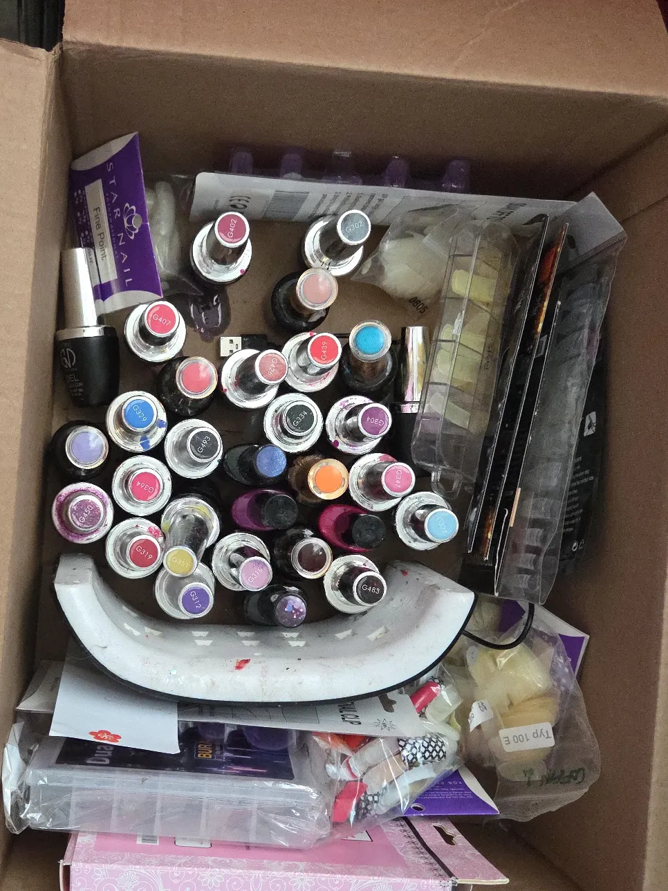 Selling a collection of mixed nail art supplies! Includes various gel polishes with different colours, nail tips, and other accessories. Perfect for anyone who loves doing their own nails at home