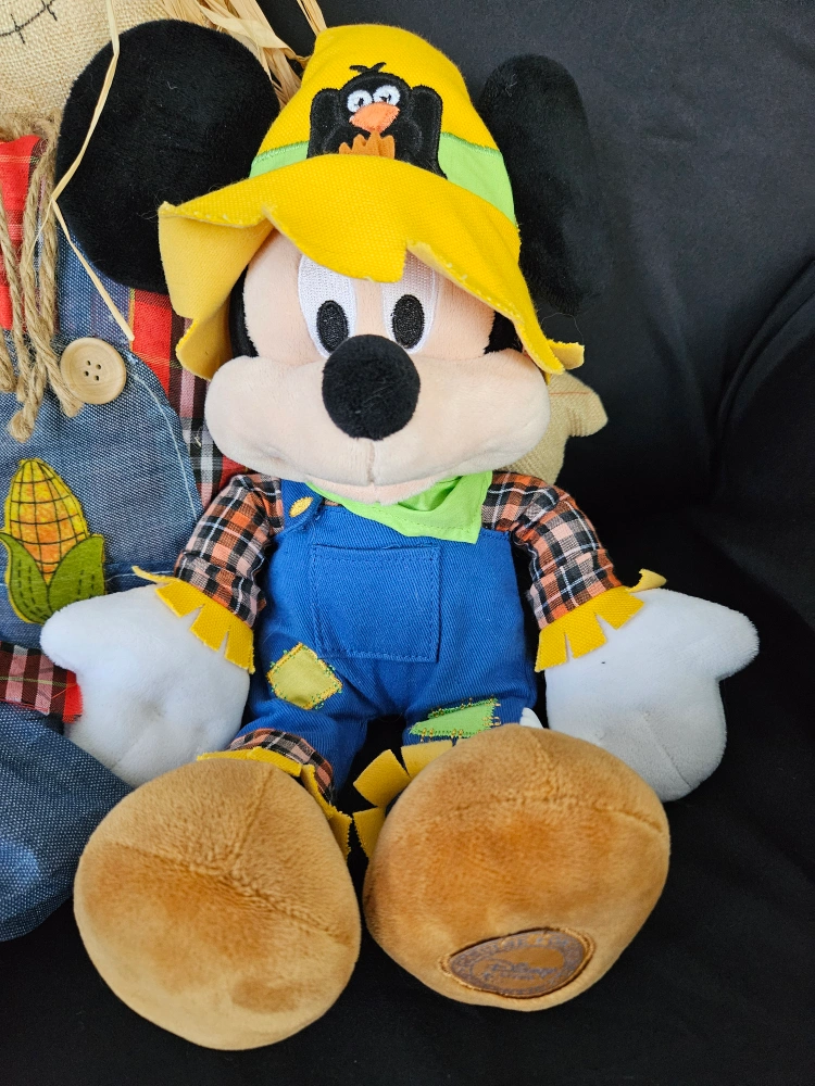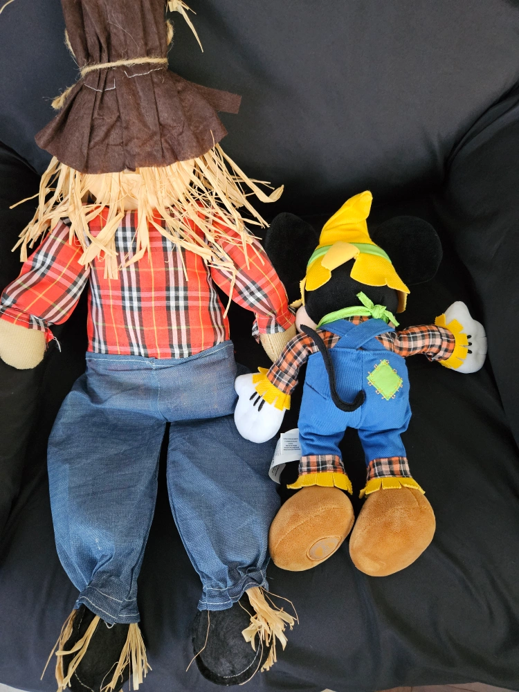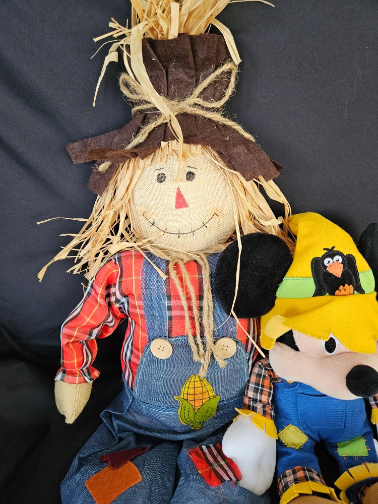65Scarecrow (approx 68 cm long) & Mickey Mouse (approx 34 cm long). Have not been played with. They were only used as fall decor and then stored. Selling as a pair.
