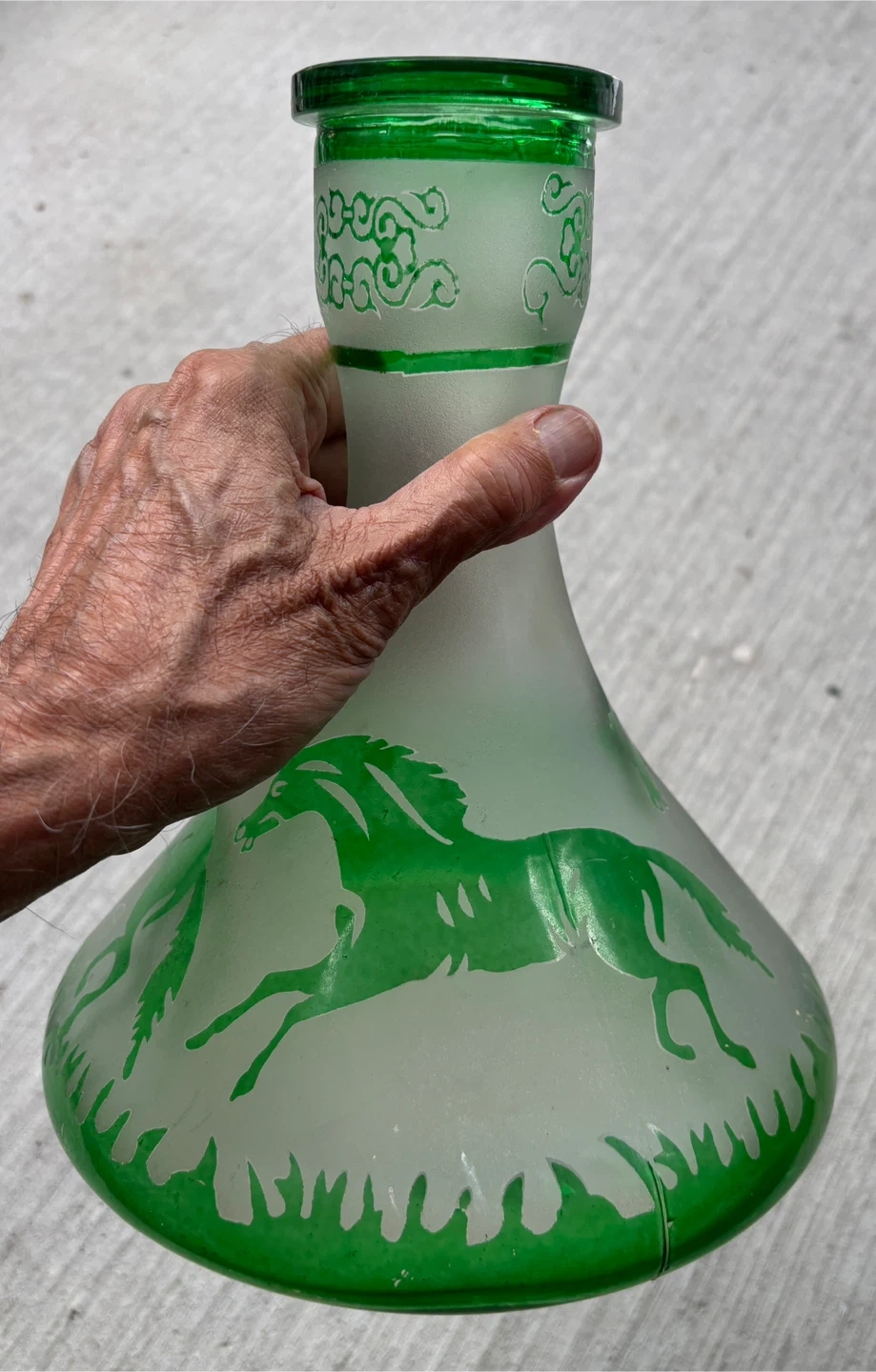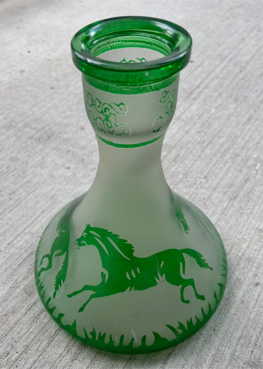 97Selling a unique green etched glass vase! It features a beautiful design with horses. Perfect for adding a touch of elegance to any room!