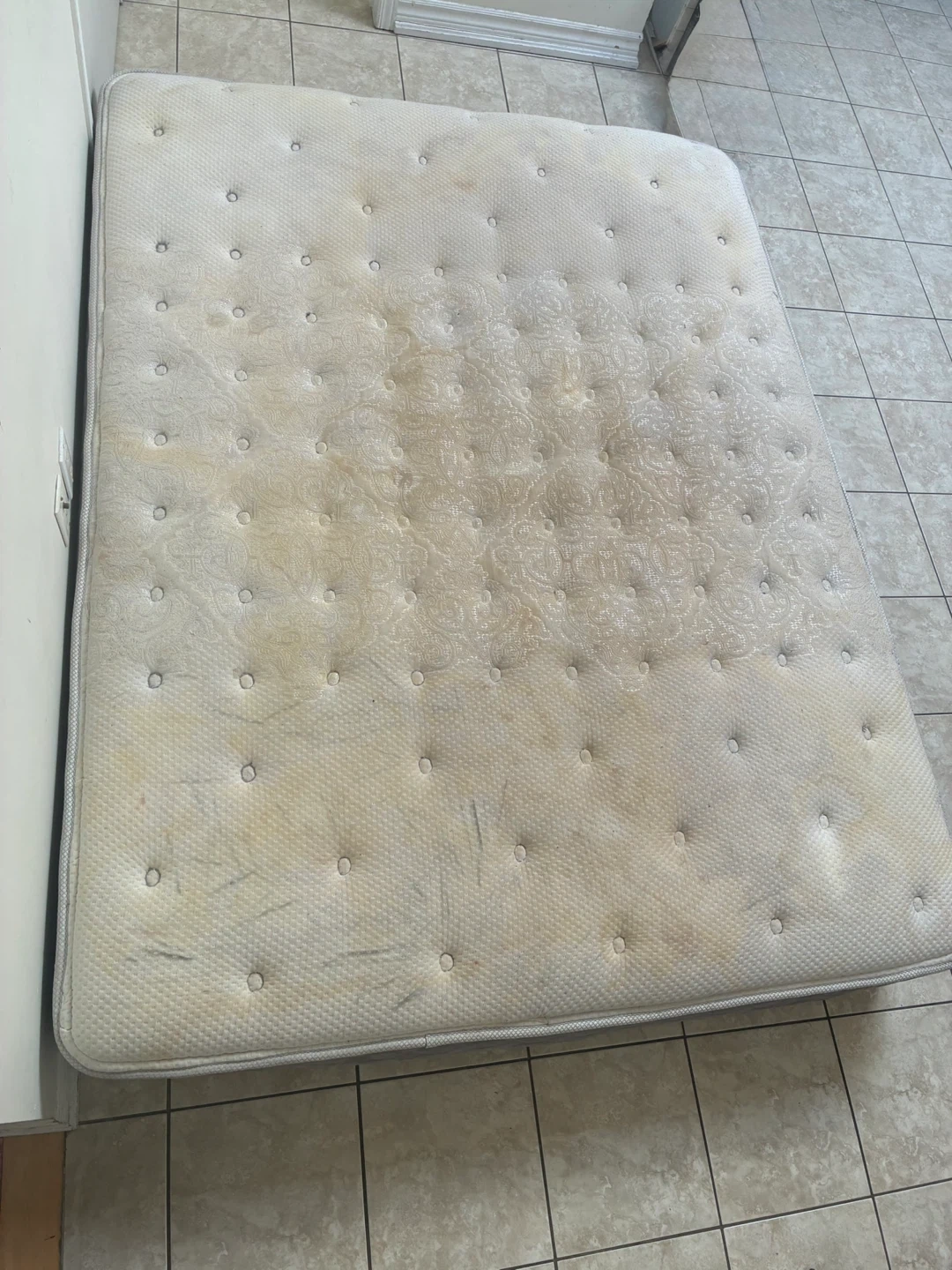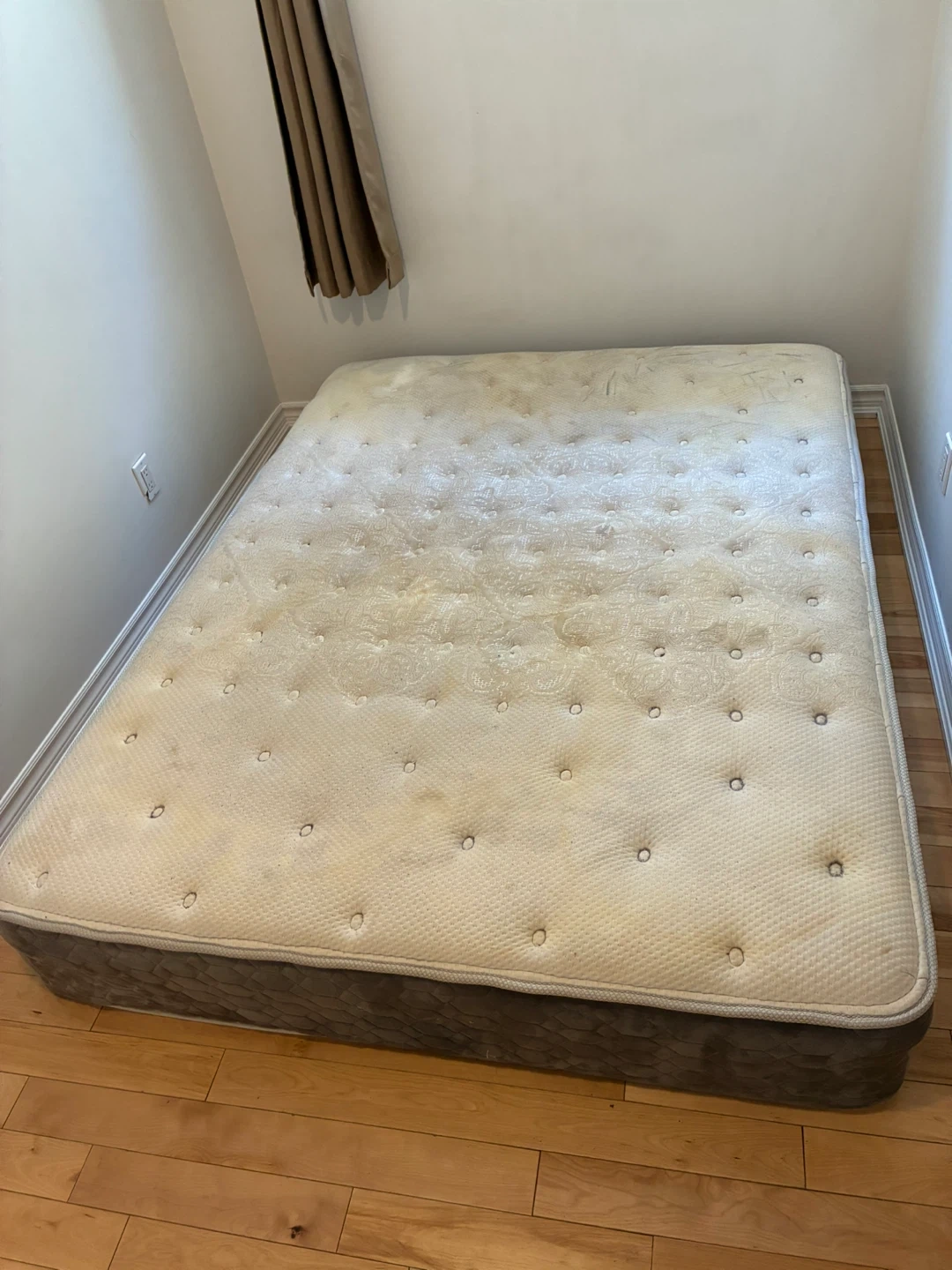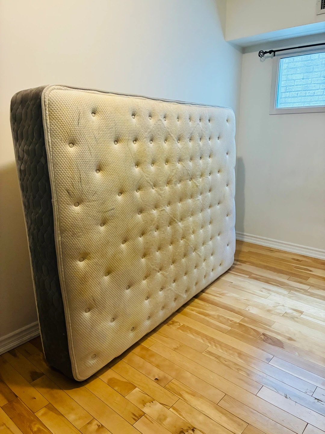 Selling a firm queen mattress. It has some visible wear but is clean and in good condition. Perfect for someone looking for a budget-friendly option