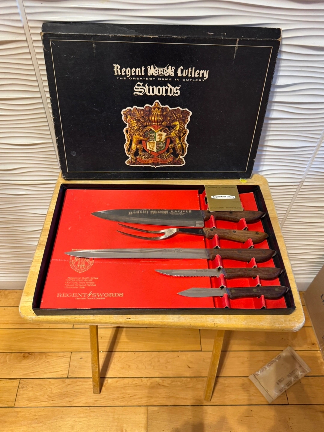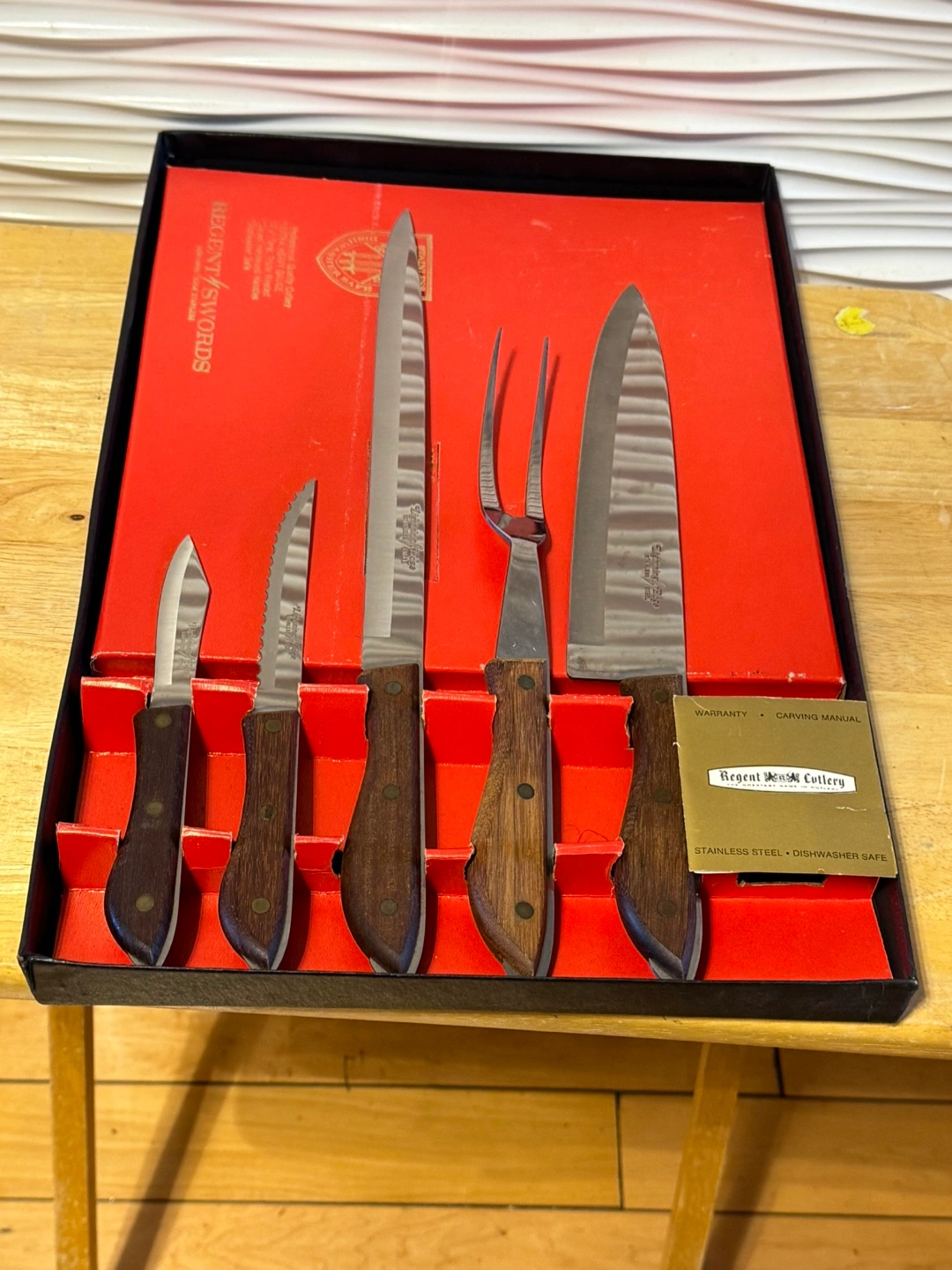 Selling a set of Regent Rock Cutlery Swords knives! The set includes various knives and a fork, all neatly arranged in their original box. The knives feature wooden handles and stainless steel blades. They are also dishwasher safe! Perfect for any kitchen.