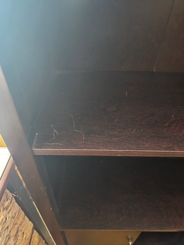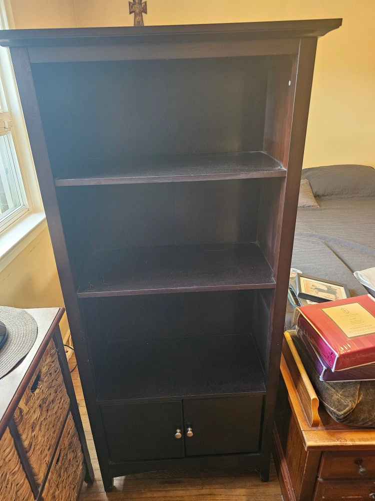 Selling a dark brown wooden bookcase with a cabinet at the bottom. It has some minor wear and tear, but is still in great condition. The bookcase has multiple shelves for storage and display, and the cabinet provides additional enclosed storage space. Great for organizing books and other items!