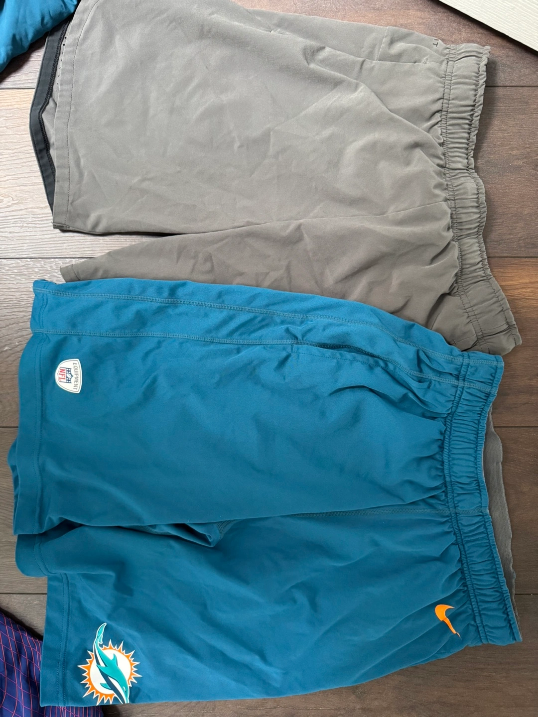 138I have a couple pairs of shorts for sale. One pair is a neutral grey colour, and the other is a Miami Dolphins blue. The blue pair features the Miami Dolphins logo and the Nike swoosh. Both are in good condition!