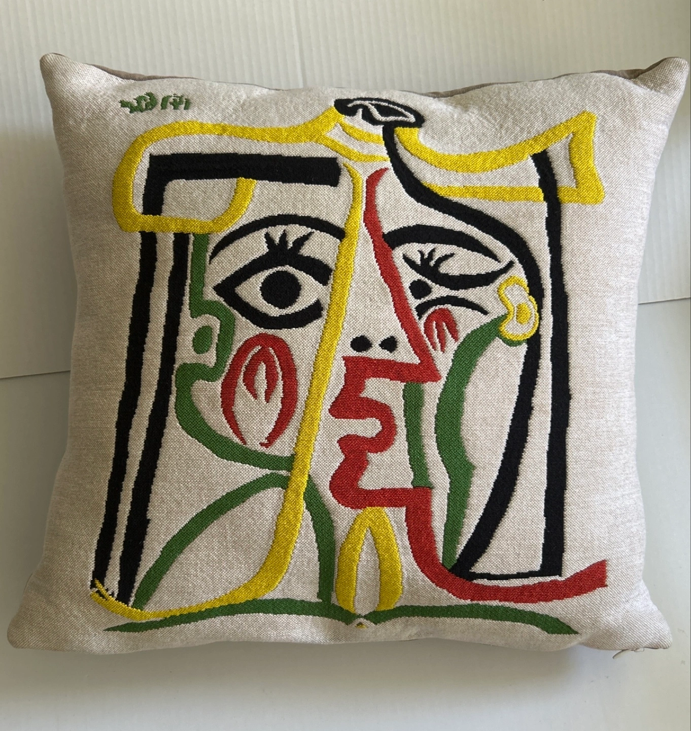 Add a touch of artistic flair to your home with this Succession Picasso throw pillow! The pillow features a unique embroidered design inspired by Picasso's iconic style. It's in great condition, clean and ready to liven up any couch or chair.
