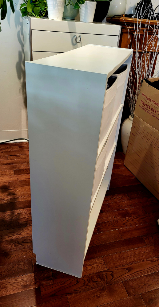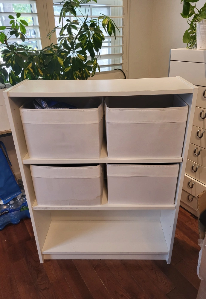I'm selling an IKEA Kallax shelf unit in good condition. It comes with four inserts as shown in the photos. Perfect for organizing your space!