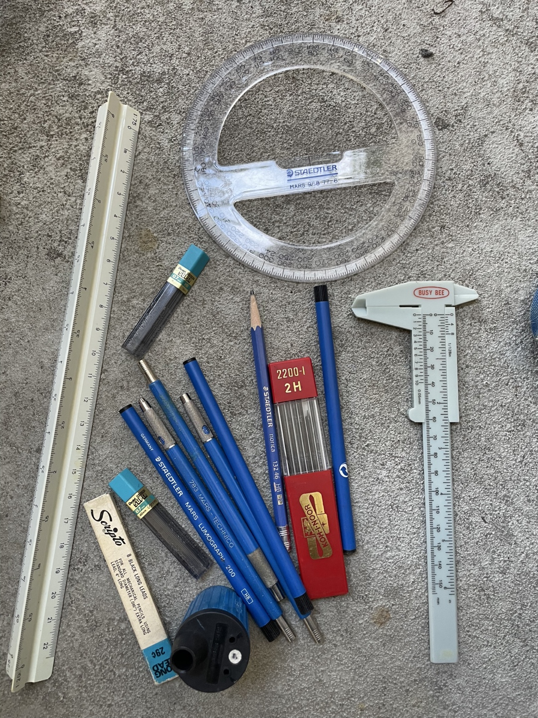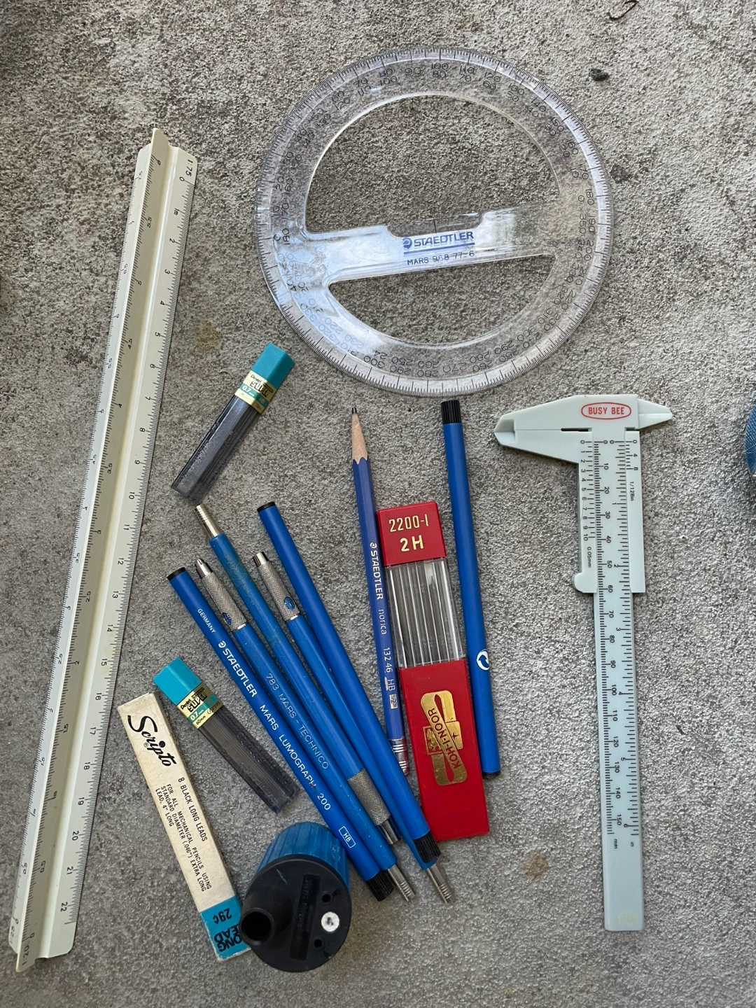 Selling a collection of drafting tools including Staedtler Mars Lumograph technical pens, a Staedtler protractor, Koh-I-Noor leads, and a Busy Bee caliper. Perfect for students or professionals in architecture or engineering.