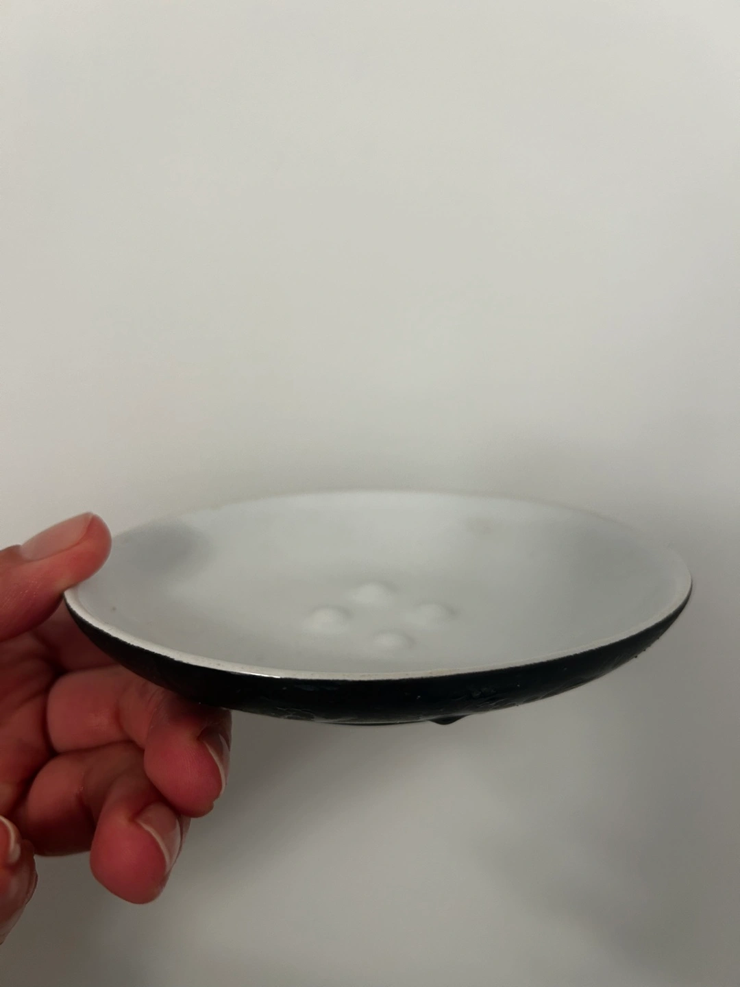 A small dish with a black exterior and white interior. It's in good condition and ready for a new home