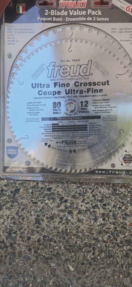 Selling a Freud 2-Blade Value Pack, which includes: - One 12" x 44 General Purpose blade - One 12" x 80 Ultra Fine Crosscut blade These blades are suitable for use with a mitre saw, slide mitre saw, or table saw. The Ultra Fine Crosscut blade features 80 teeth and a thin kerf, requiring less power. It's made in Italy and has a laser-cut body for flatness and durability