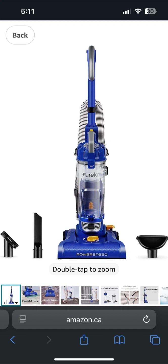 Selling a Eureka Powerspeed upright vacuum cleaner in blue. It features a powerful motor and multiple height settings. It also comes with on-board accessories and is easy to assemble.