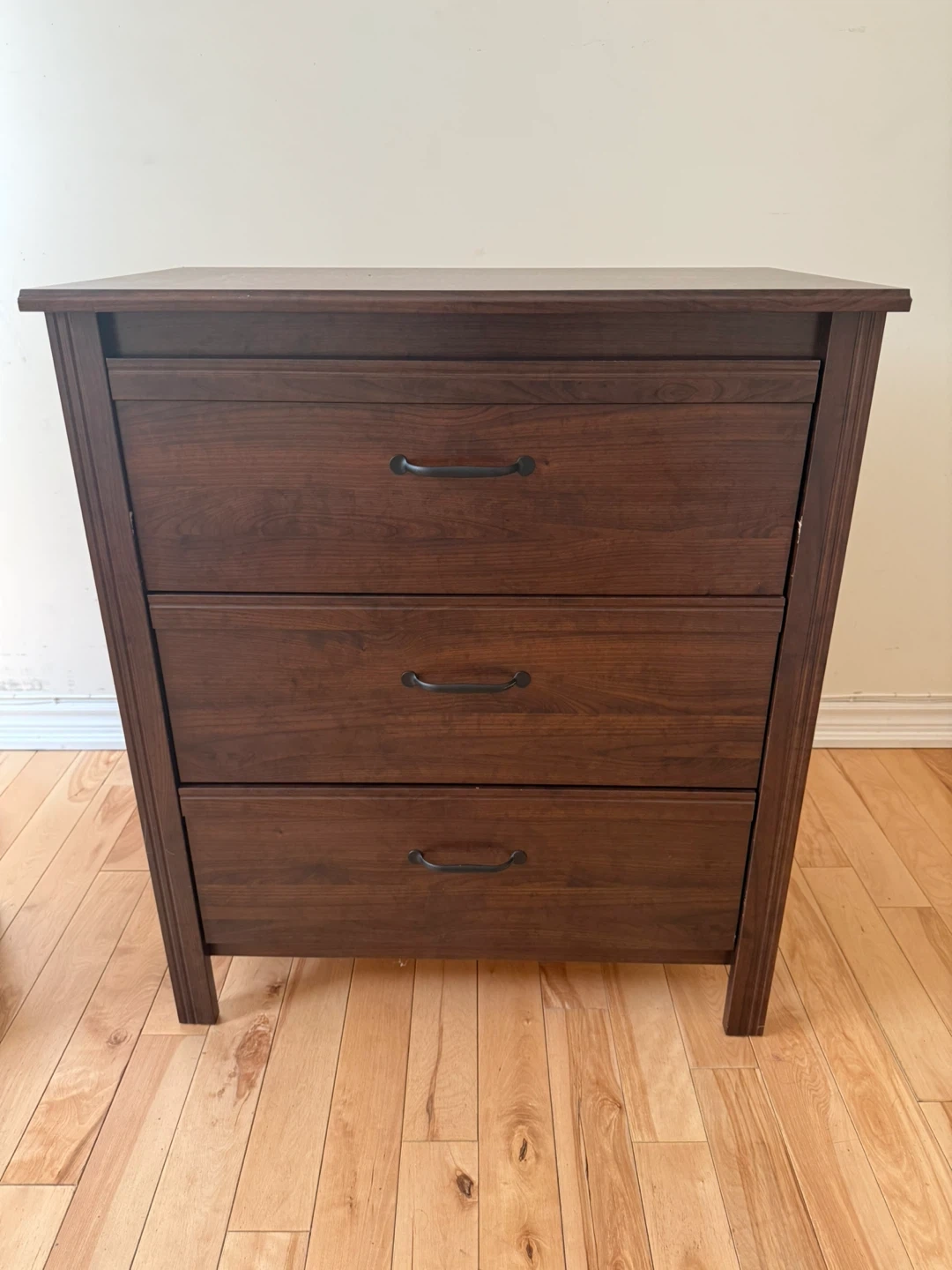 Selling a brown wooden dresser with three drawers. It has a few minor scratches on top, and the top draw is wonky, can still close but otherwise it's in good condition. Perfect for adding some storage to your bedroom or living space!