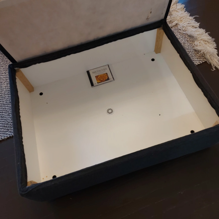 Here's an ilkea storage ottoman in great shape! It's perfect for storing blankets, books, or anything else you want to keep out of sight but close at hand. It would be a great addition to any living room or bedroom. Nb. CD is not included ;-) but is there to give you a sense of scale.