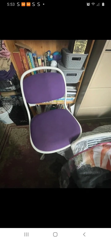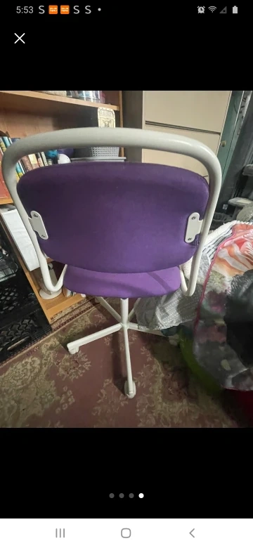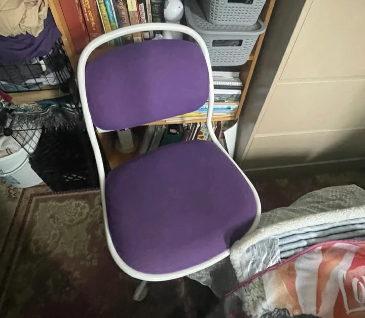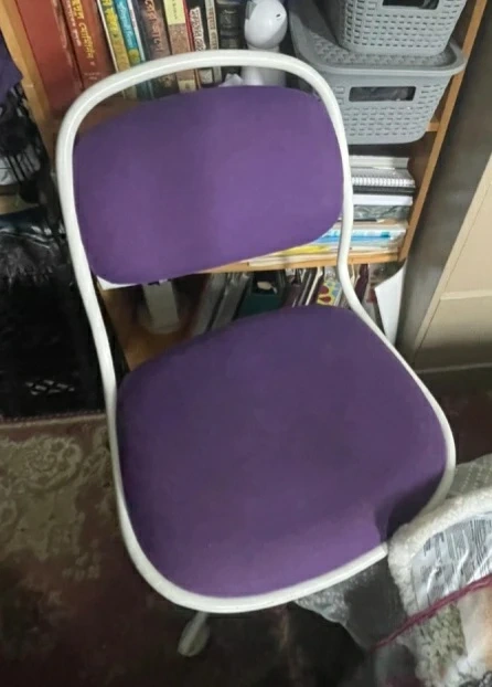 Here's a comfy purple desk chair! It would be great for a student or home office setup. The chair has a white frame and a purple seat and back. It's in good condition and ready for a new home $25